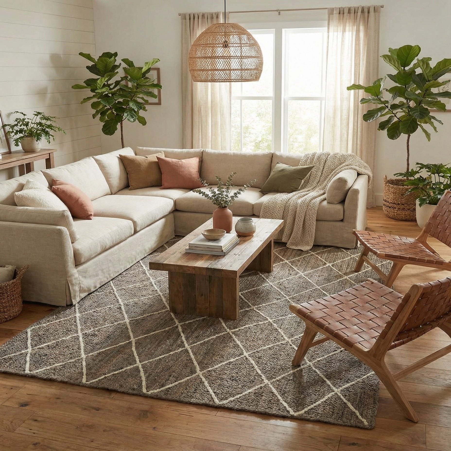 This rug works well in casual and modern spaces alike — think a living room with warm wood furniture and leather seating, a sunlit entryway, or a dining area beneath a simple wooden table. It pairs naturally with neutral linens, woven baskets, and greenery for a coastal or farmhouse look, and it complements minimalist or Scandinavian interiors when combined with crisp whites and black metal accents. For layered texture, place it under a softer wool rug or use it alone to ground seating areas and define open-plan rooms.