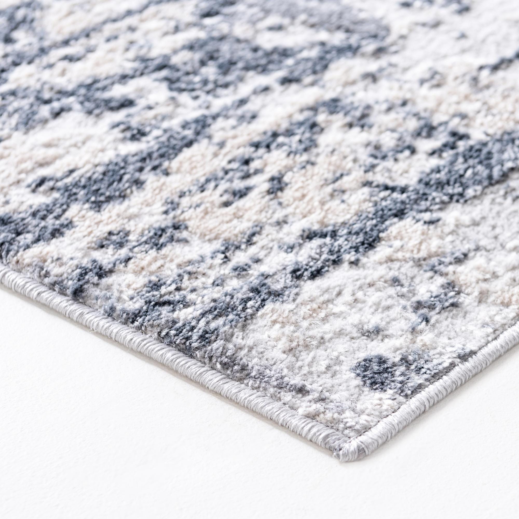 A modern abstract design of painterly striations and distressed veining lays across a soft gray ground, with ivory highlights that catch the eye and add depth. The pattern reads like layered brushstrokes, alternating denser charcoal-like marks with lighter washes of ivory for a lived-in, dimensional look. Machine-made construction in 60% polypropylene and 40% polyester produces a low-profile pile with a soft hand and a subtle sheen from the polyester fibers, giving the surface a tactile feel underfoot while keeping the overall silhouette clean and contemporary.