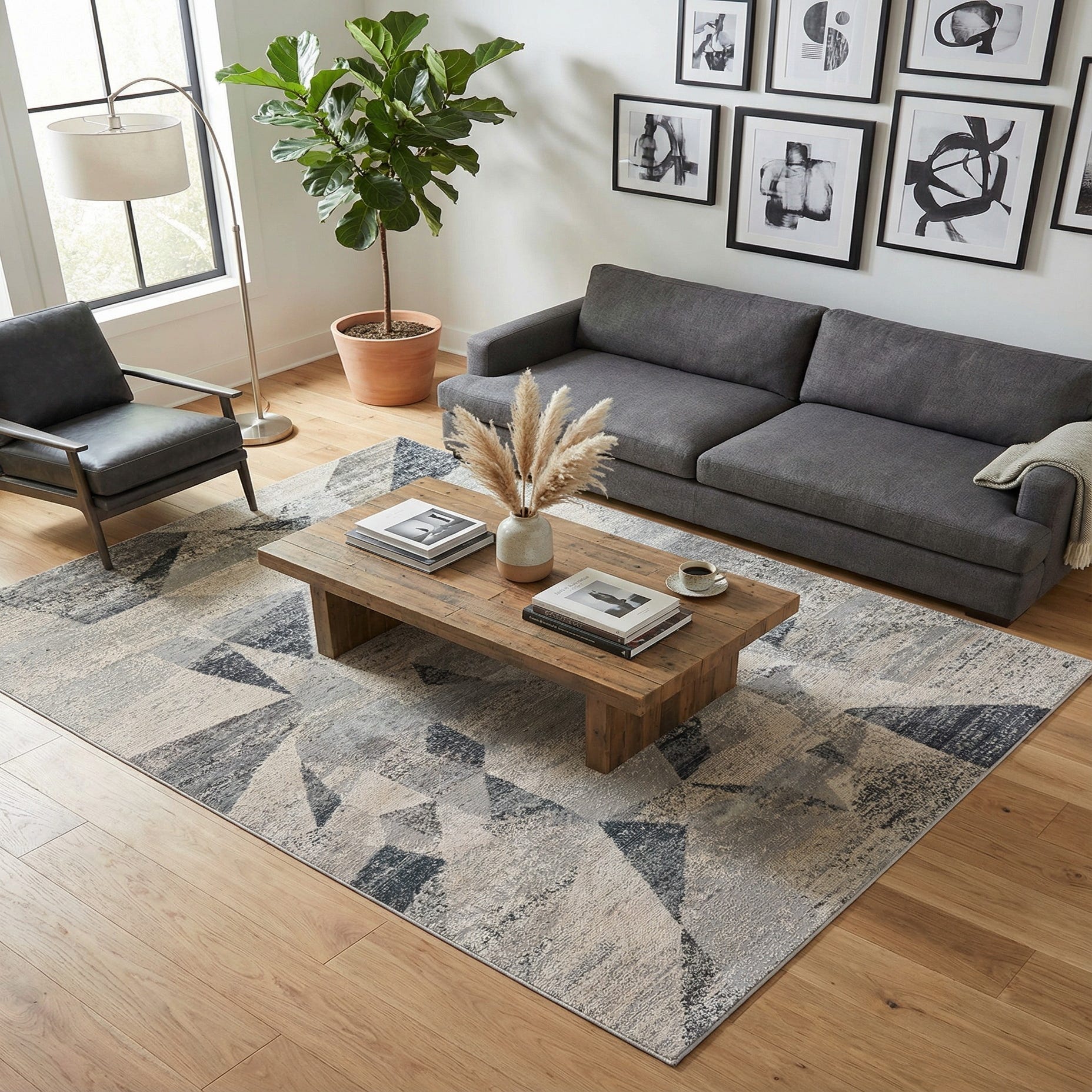 This piece works well anchoring a seating area beneath a neutral or navy sofa, adding calm texture at the foot of a bed, or bringing visual interest to a streamlined home office. It pairs naturally with light- to medium-tone woods, brushed metals, and cool-toned textiles—suiting contemporary, mid-century modern, or coastal-inspired interiors that favor layered neutrals and restrained color accents.