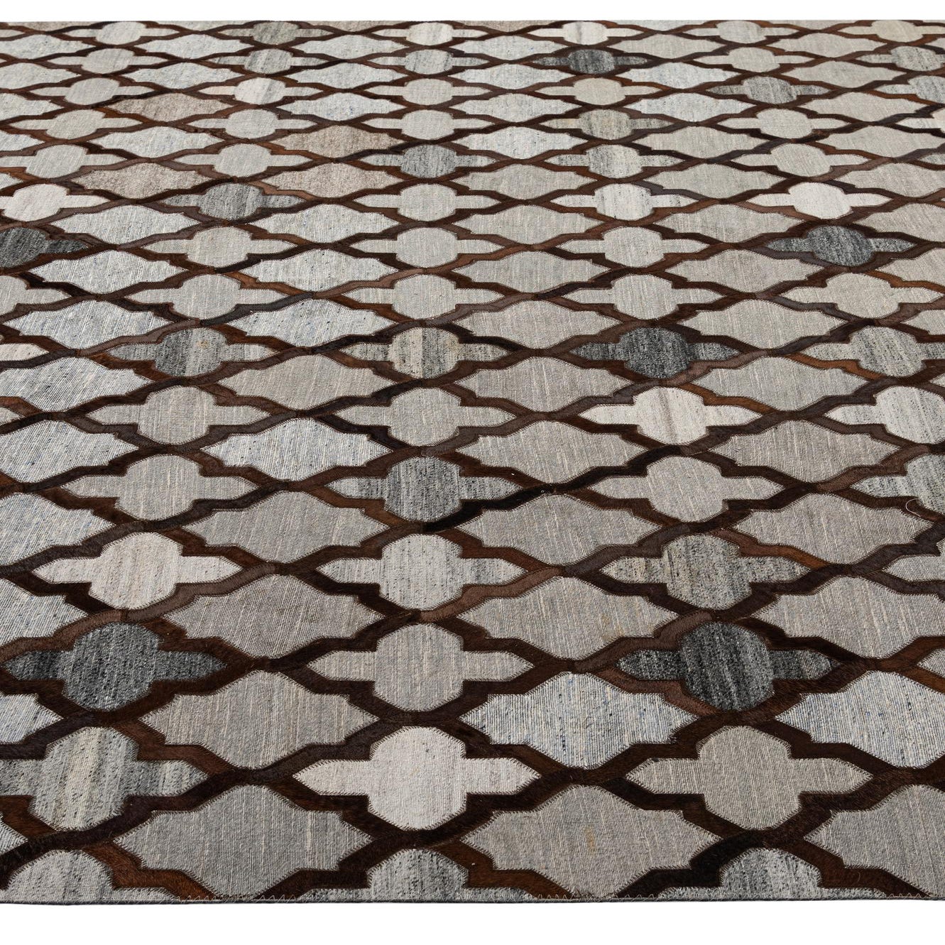 Hand made of cowhide and leather, this patchwork rug pairs a soft gray background with a repeating geometric trellis of deep brown leather. Quatrefoil-shaped cowhide panels in varied grays are framed by the leather lattice and punctuated by black and brown accents, creating a structured, layered look. Run your hand over the surface and you'll notice the low natural nap of the hide, contrasted by the firmer, slightly raised edges where the leather pieces are joined — a tactile mix of smoothness and subtle texture.