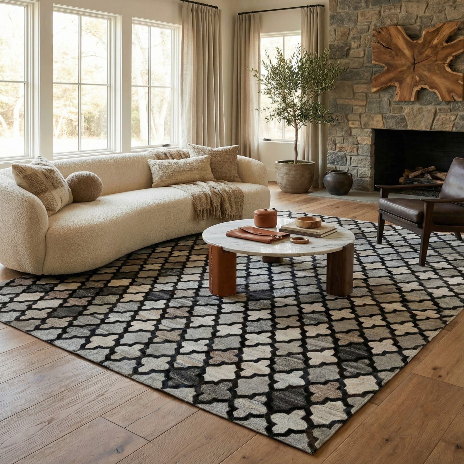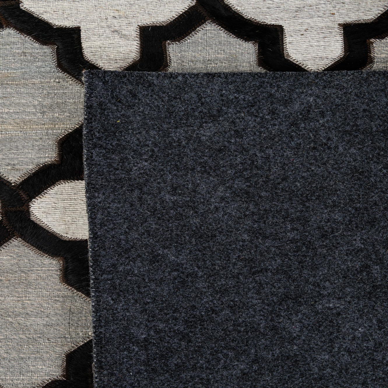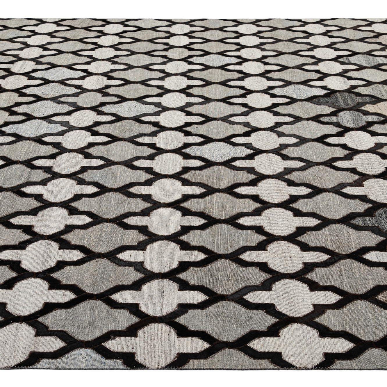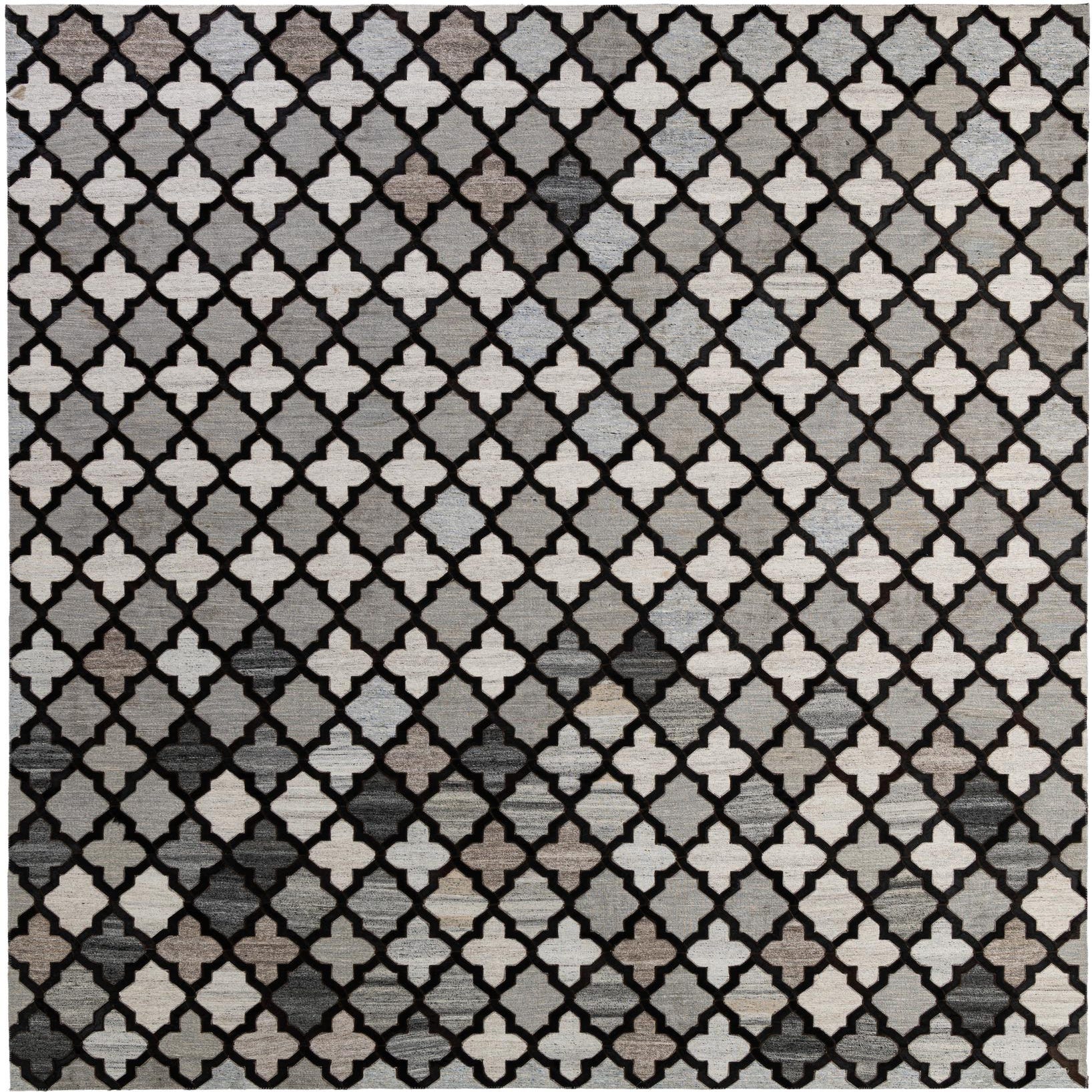An 8x10 rectangular Cowhide - Patchwork rug featuring a modern geometric pattern of black quatrefoils over varied gray and silver patches.