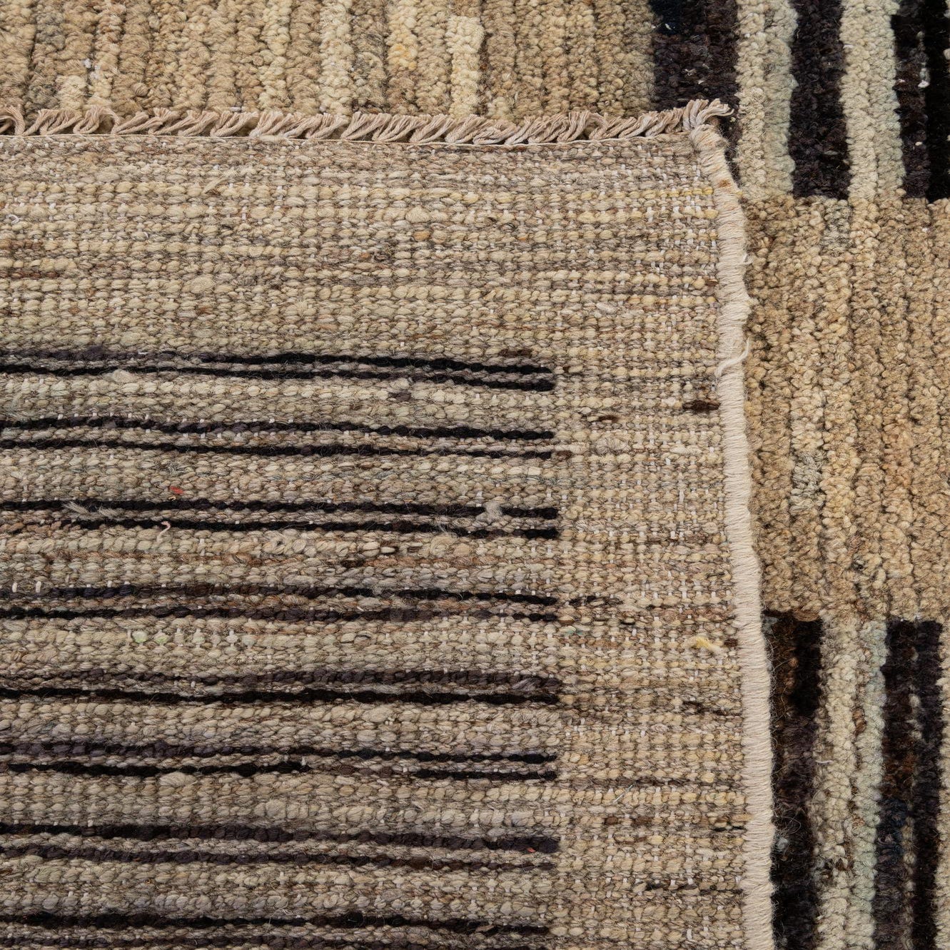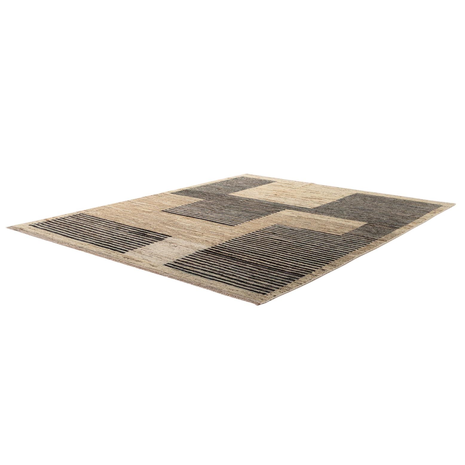 A rectangular 8x10 Darya rug with a modern stripe pattern in varying shades of gray and silver, handmade from 100% wool.