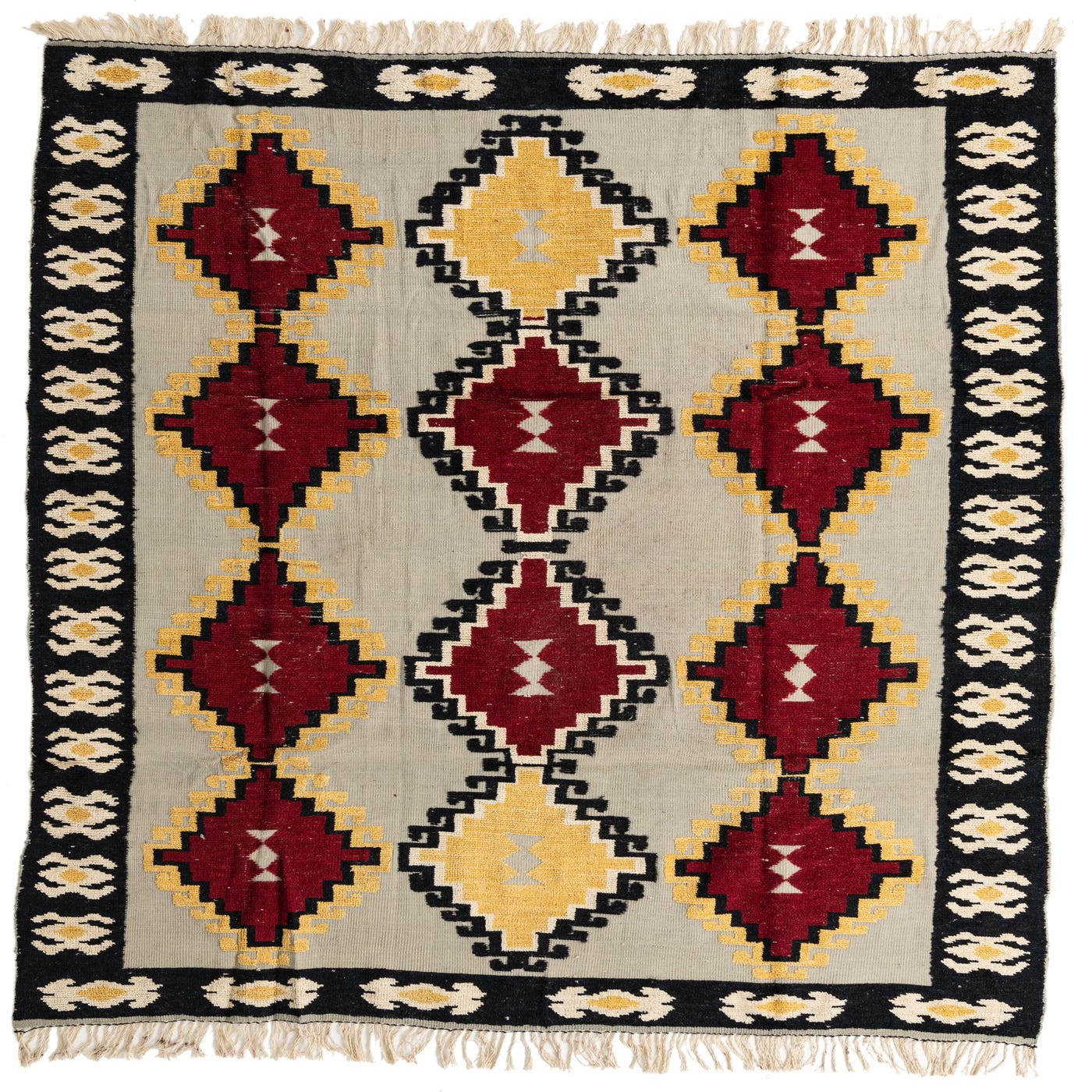 Primary color is Gray. Colors in this rug include: Gray, Black, Red, Yellow, Ivory.