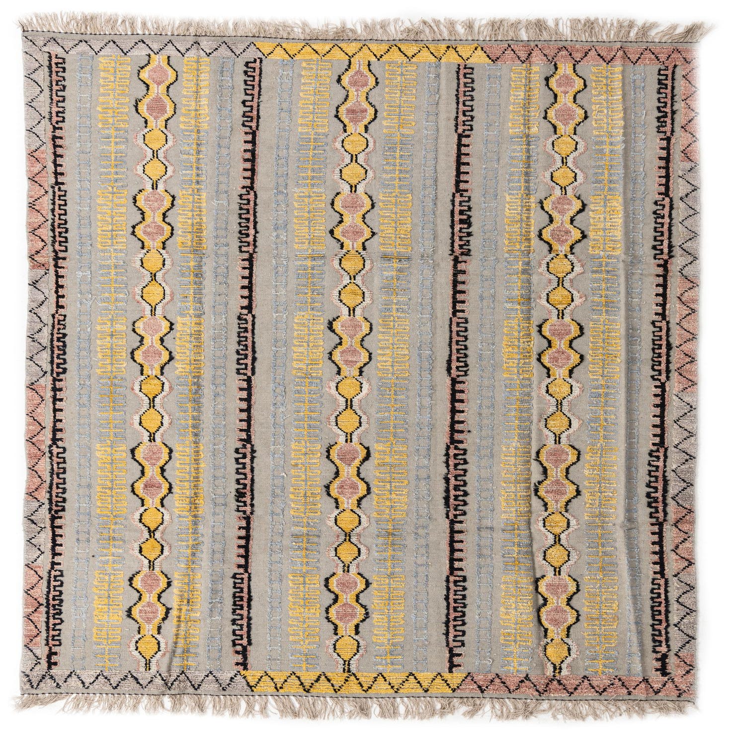 Primary color is Gray. Colors in this rug include: Gray, Beige, Yellow, Black, Light Blue, Light Salmon, Ivory, Light Brown.