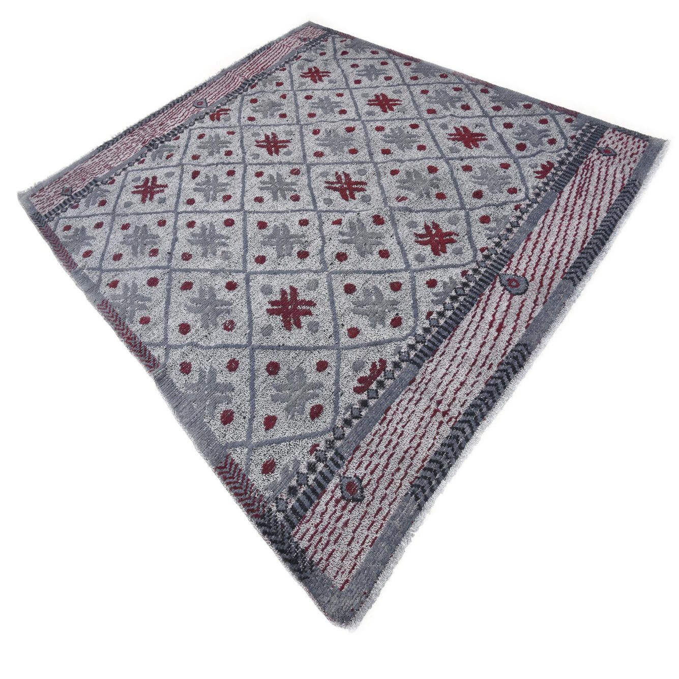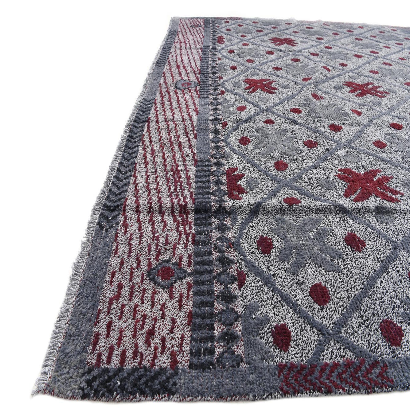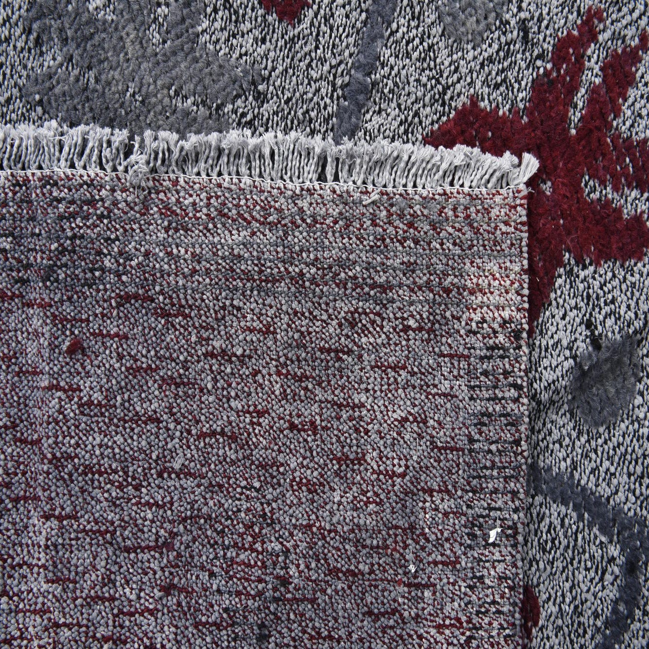 Primary color is Gray. Colors in this rug include: Gray, Burgundy.