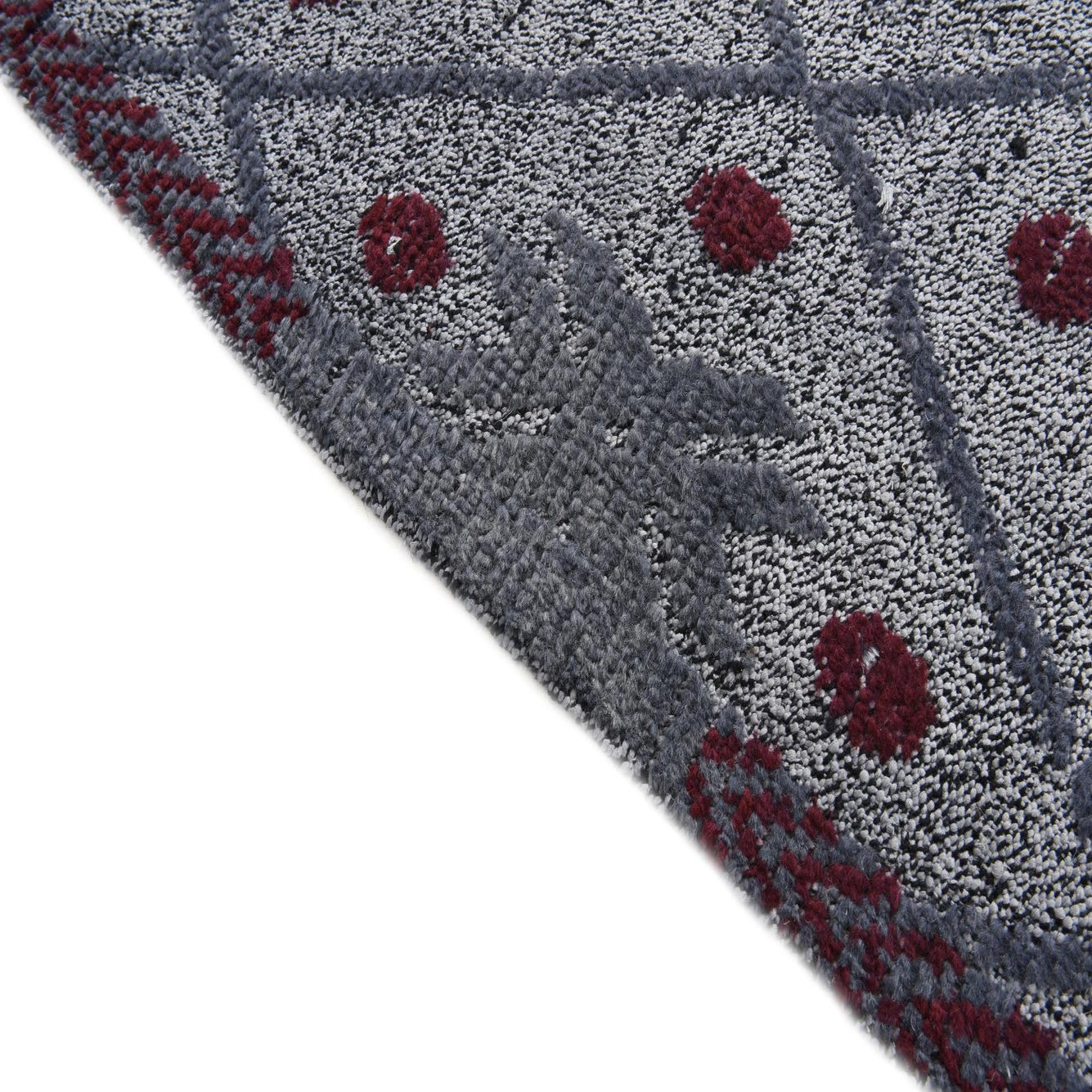 Its pattern is composed of a geometric diamond lattice that imparts a sense of order and structure, interspersed with burgundy motifs that add a layer of cultural richness and depth to the design. The textured appearance of the wool offers both visual interest and tangible comfort underfoot, promising durability and a soft hand feel.