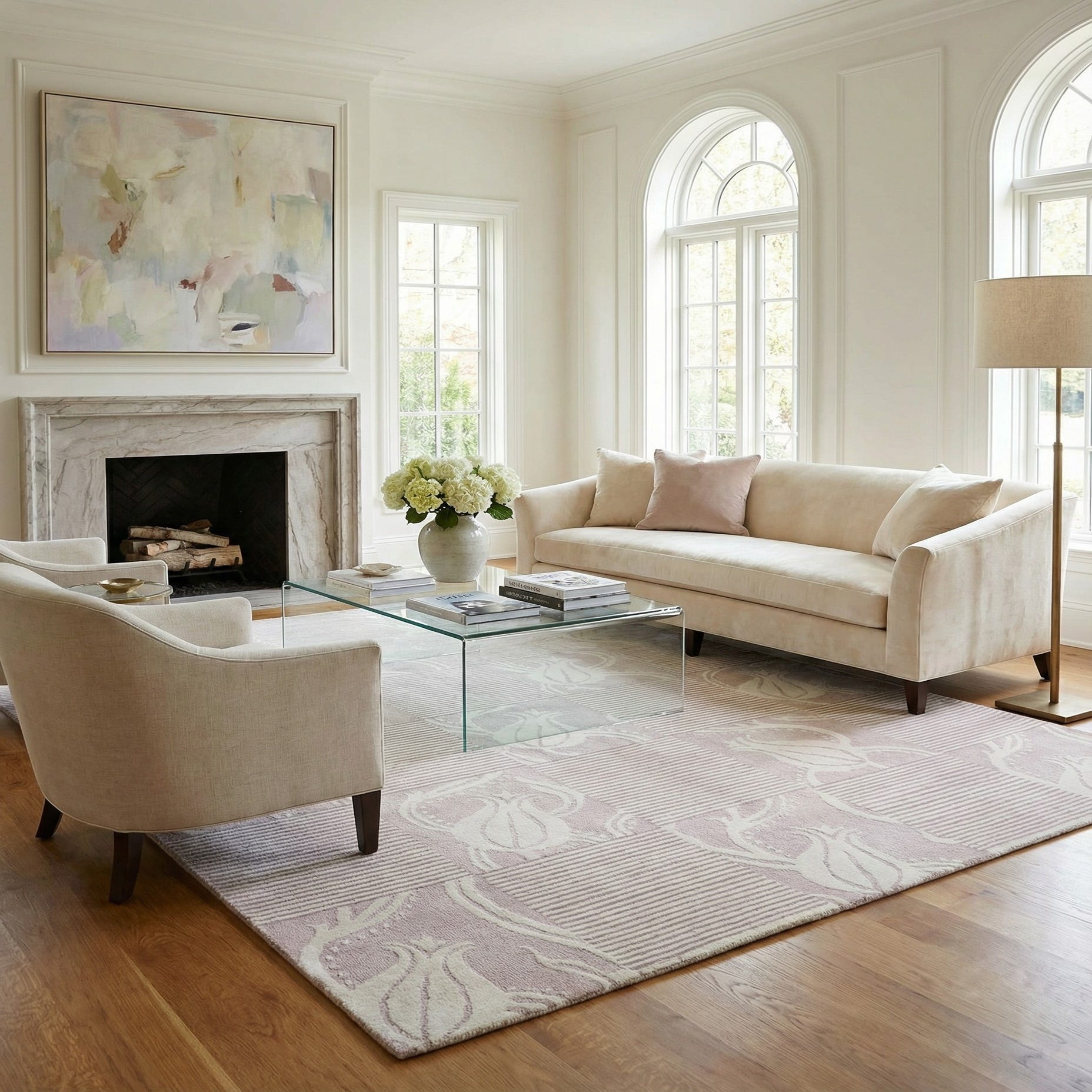 The Darya rug would integrate seamlessly into an office setting, providing a polished foundation for professional decor. It can also elevate a living room or dining area, where its serene colorway and design can harmonize with both neutral and bold color schemes, as well as a variety of furniture styles. Whether grounding a sleek, contemporary setting or adding a fresh twist to a traditional space, this rug’s versatility and thoughtful design makes it an excellent choice for various interior design scenarios.