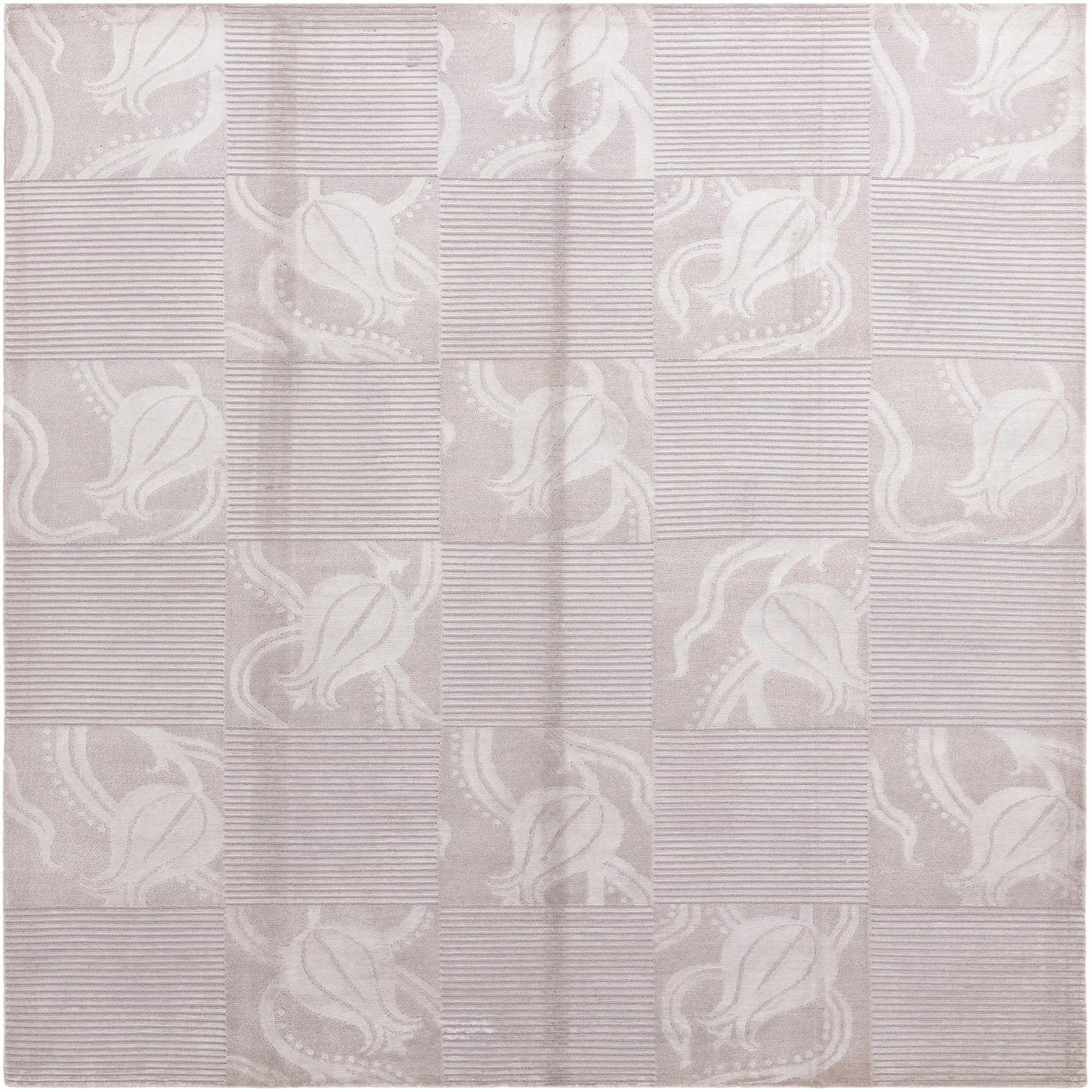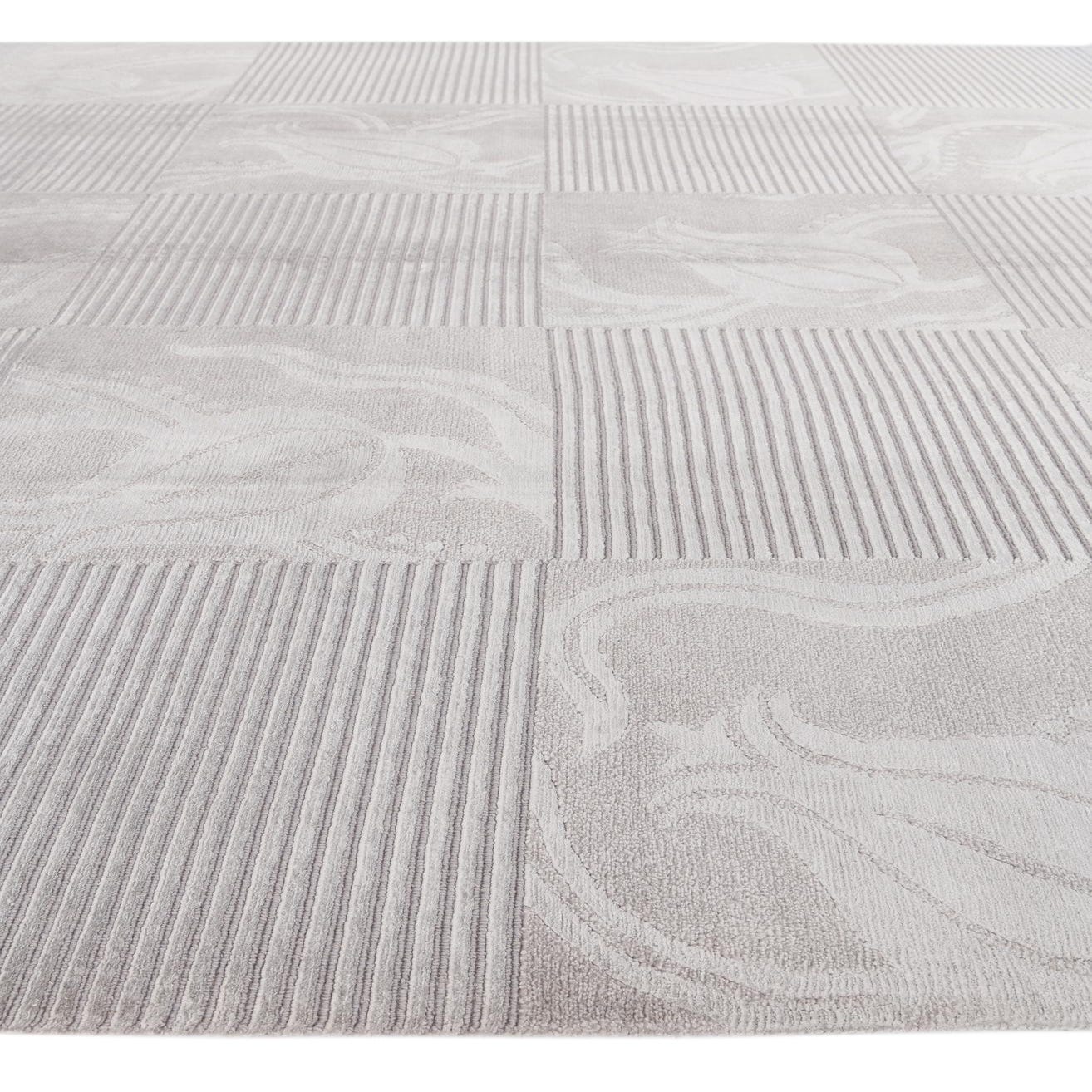 A rectangular 8x10 gray wool rug with a modern oriental pattern of alternating floral and striped squares.
