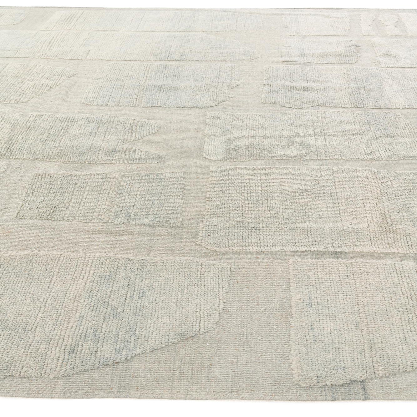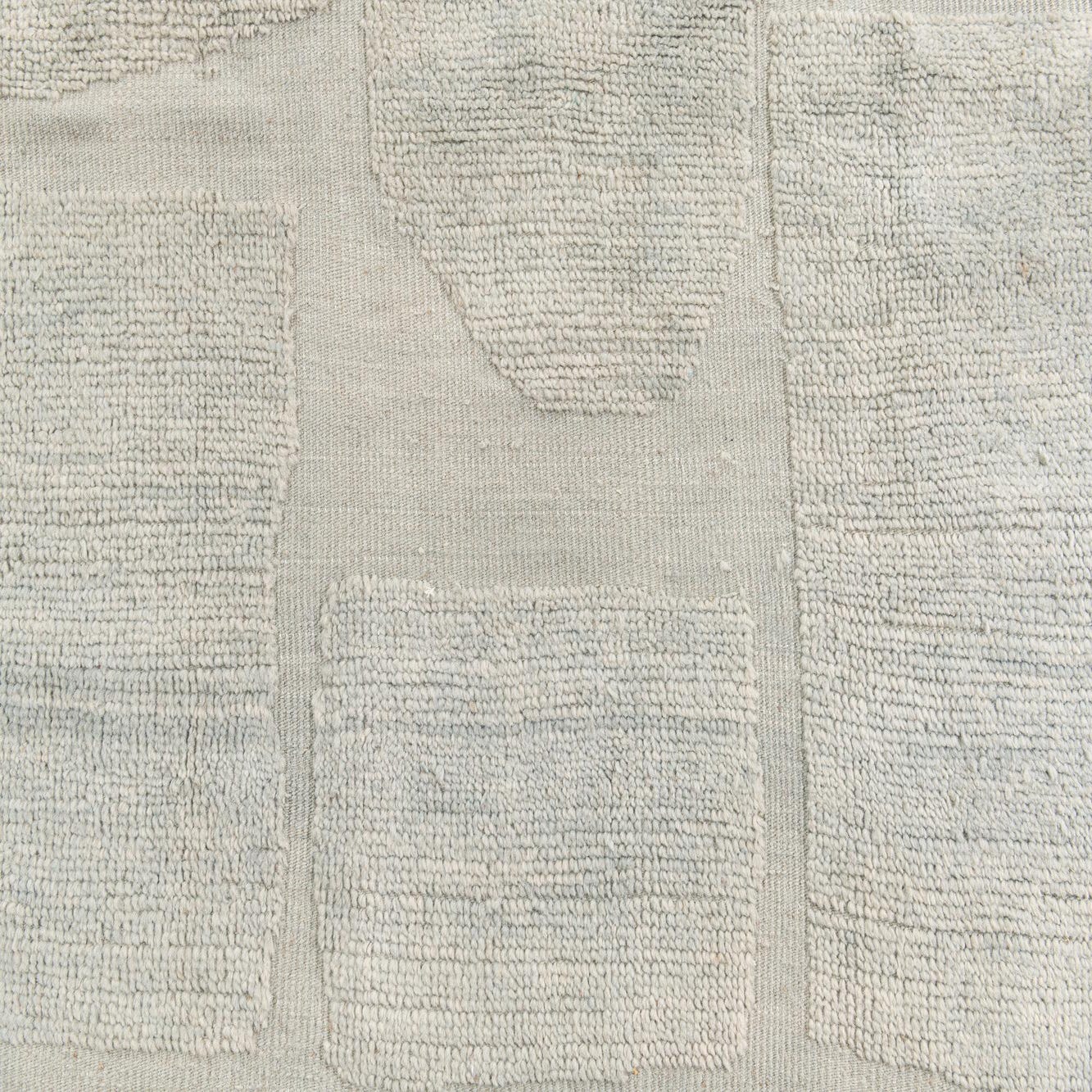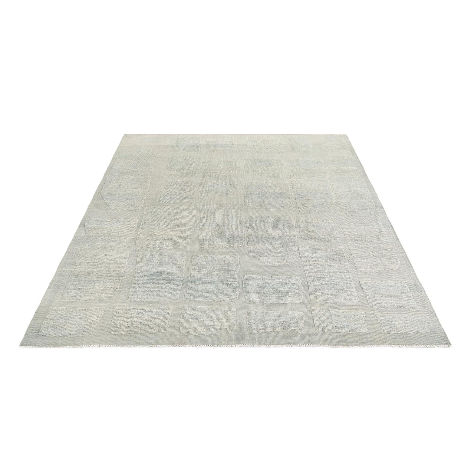A rectangular 8x10 gray wool rug with a modern abstract pattern of raised, textured rectangular and curved shapes.