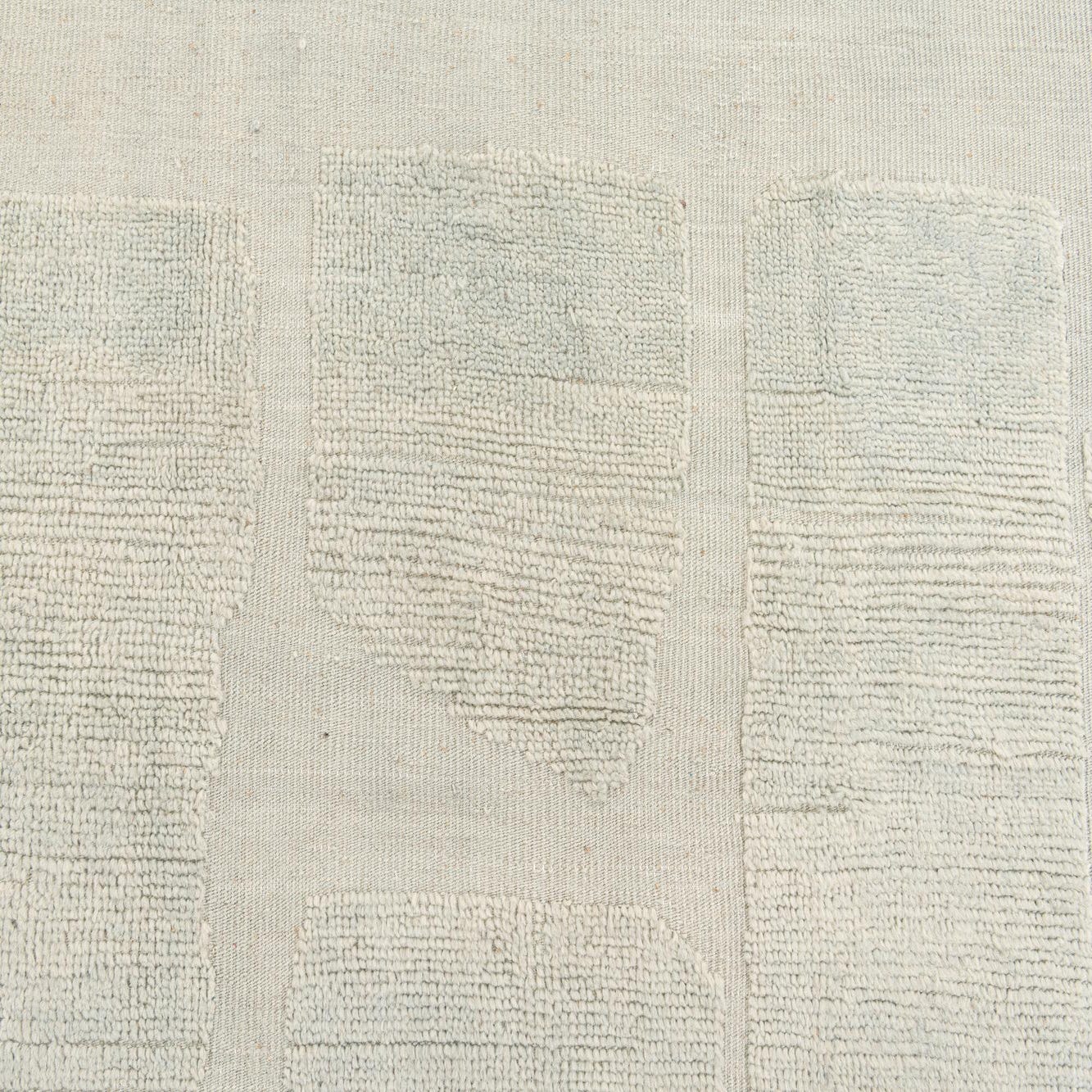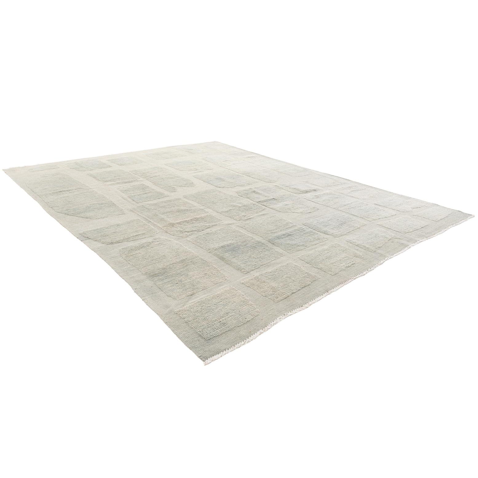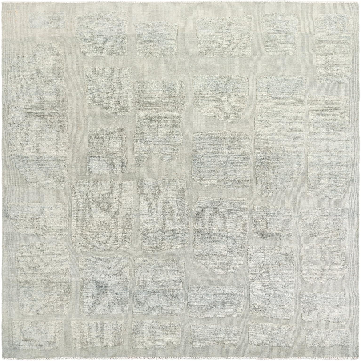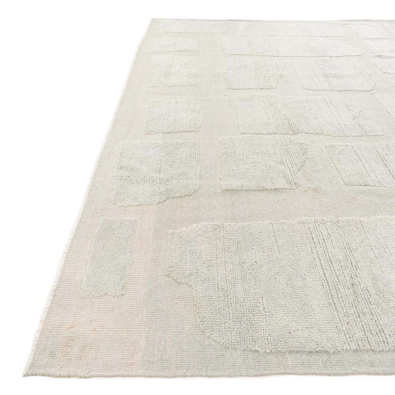 A rectangular 8x10 gray wool rug with a modern abstract pattern of raised, textured rectangular and curved shapes.