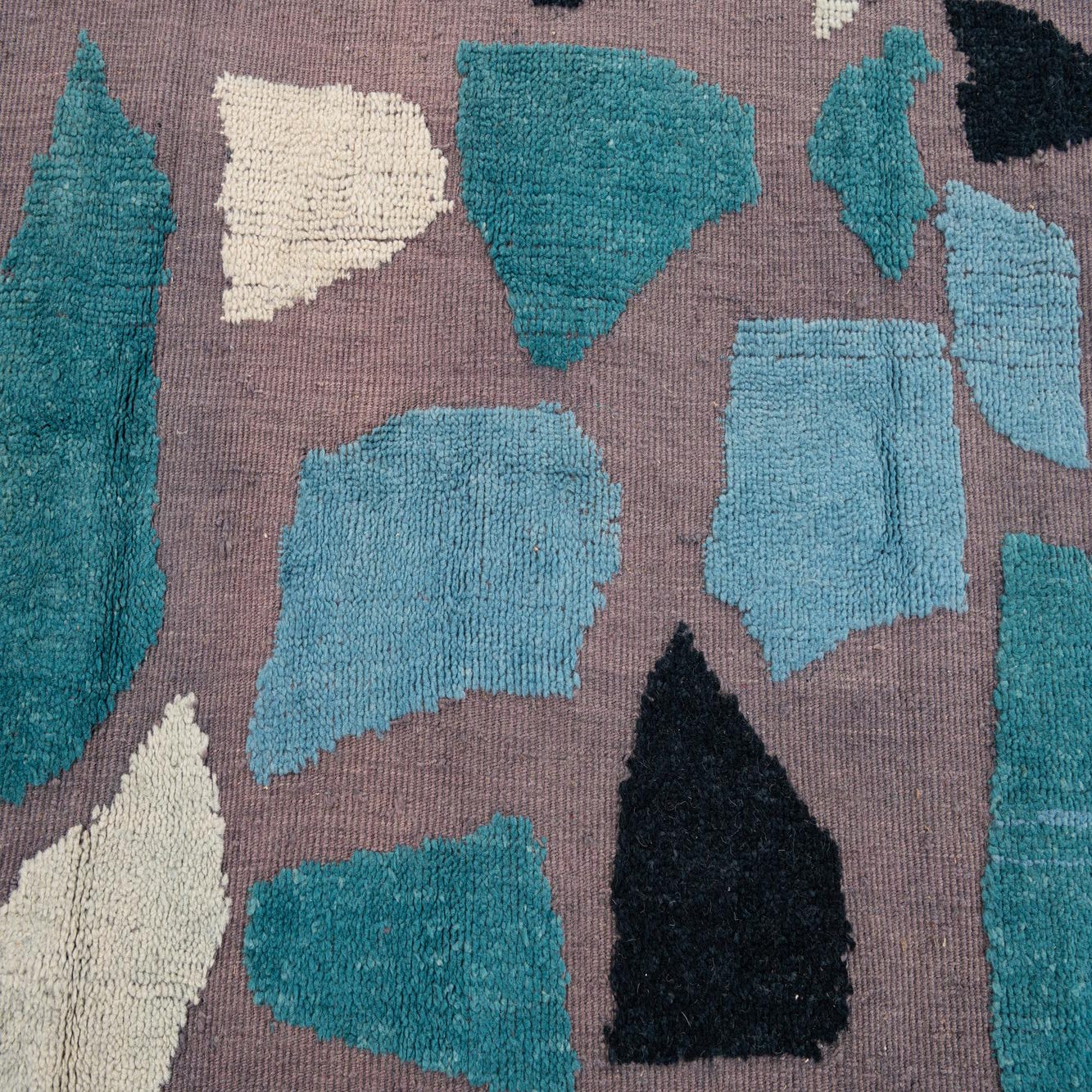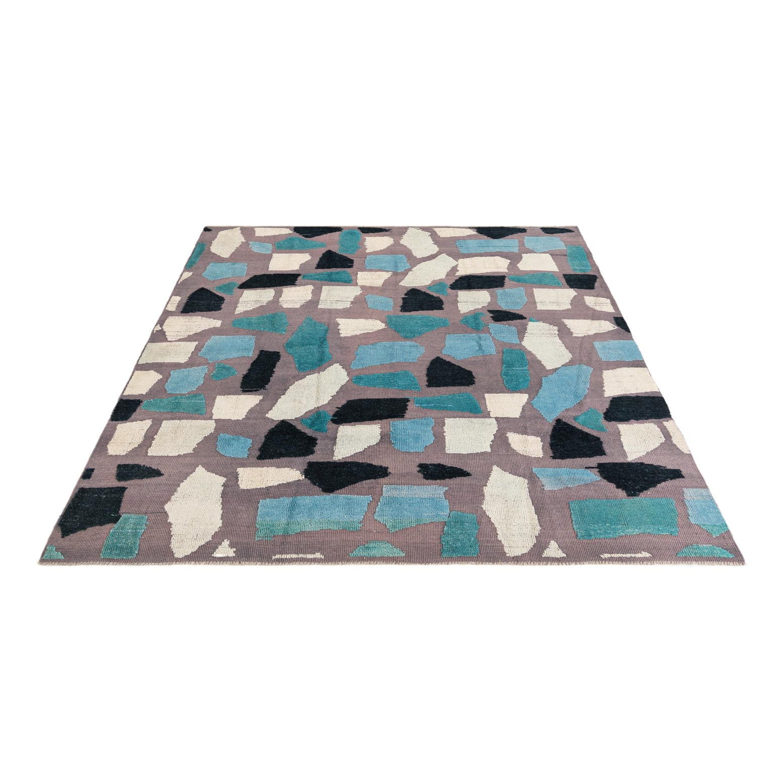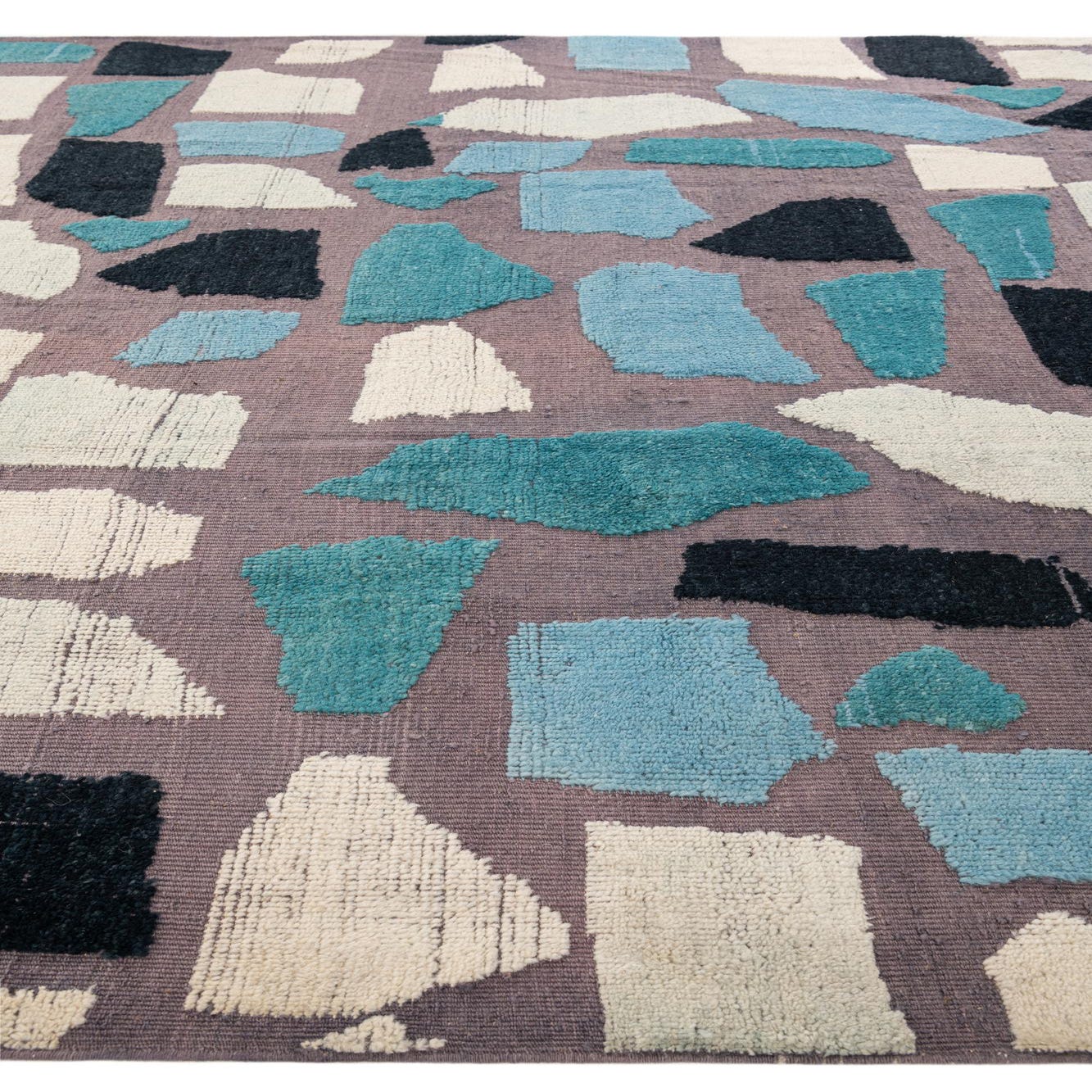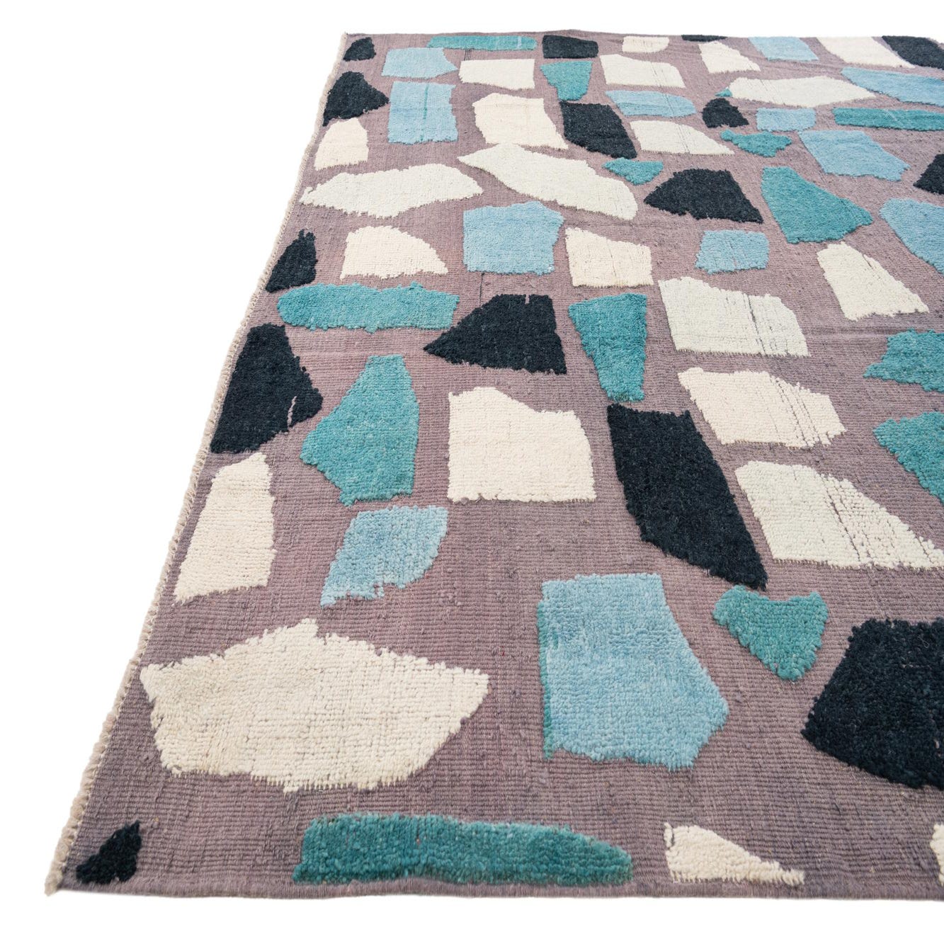 A rectangular 8x10 modern wool rug featuring an abstract pattern of light blue, teal, black, and cream shapes on a gray background.