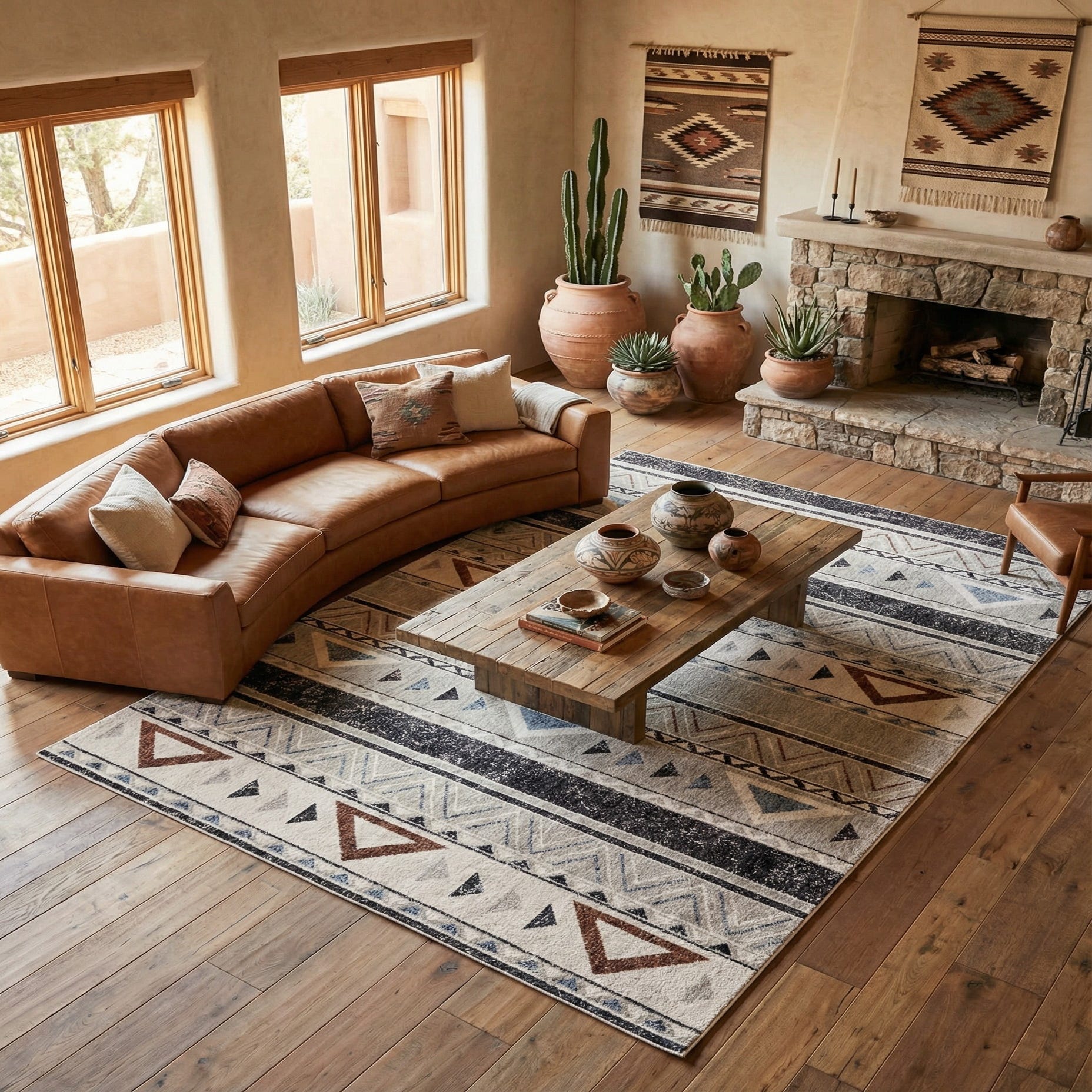 This rug fits well in casual living rooms, modern farmhouse spaces, or any room that benefits from layered, graphic patterning. Place it under a coffee table to define a seating area, use it in an entry or dining space to introduce pattern without overpowering existing furnishings, or layer it over a natural-fiber rug in a bedroom to add color and visual interest. Its gray base and balanced palette make it easy to pair with warm wood tones, leather seating, and textured textiles.