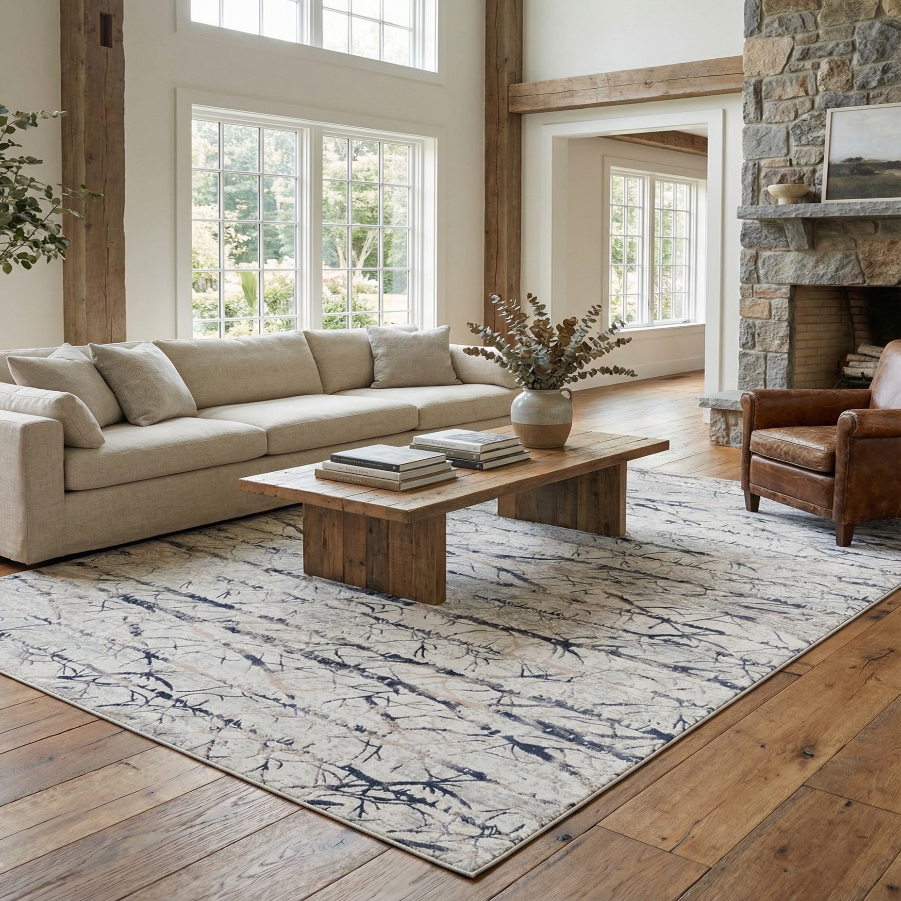 Machine-made from a 60% polypropylene / 40% polyester blend, this rug offers a soft, low pile with slight surface variation that highlights its layered pattern. The gray background is punctuated by bands of ivory and beige, with charcoal-like branch and linear marks woven across the field to create a modern, weathered effect. Running your hand over the surface you feel subtle differences in texture where the lighter tones are slightly raised, giving the design dimensionality without heaviness.