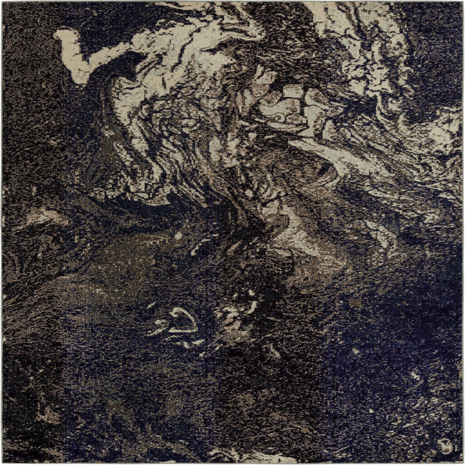 An abstract, marbled pattern moves across a gray background, with layered swirls of beige, ivory, black, brown, light brown and subtle purple accents. The design reads as fluid and organic, with concentrated areas of light and dark that create visual depth without a defined border. Machine-made from 100% polypropylene, the rug has a low-profile pile that lies flat underfoot; the tight construction gives a smooth, slightly textured hand that catches light and color shifts across the surface.