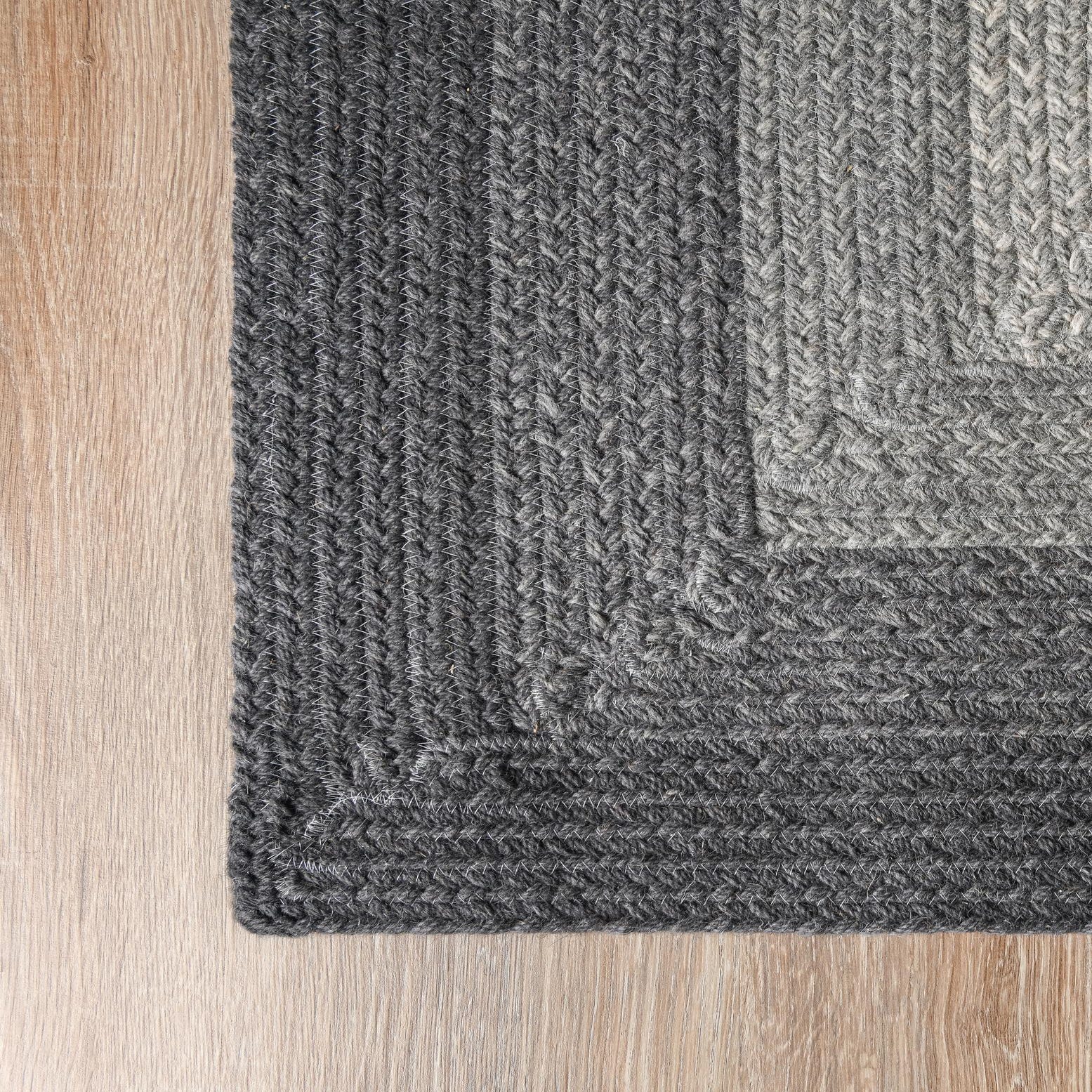 A rectangular 8x10 hand-braided wool rug featuring a gradient of grays, from dark charcoal to light silver, in a nested border pattern.