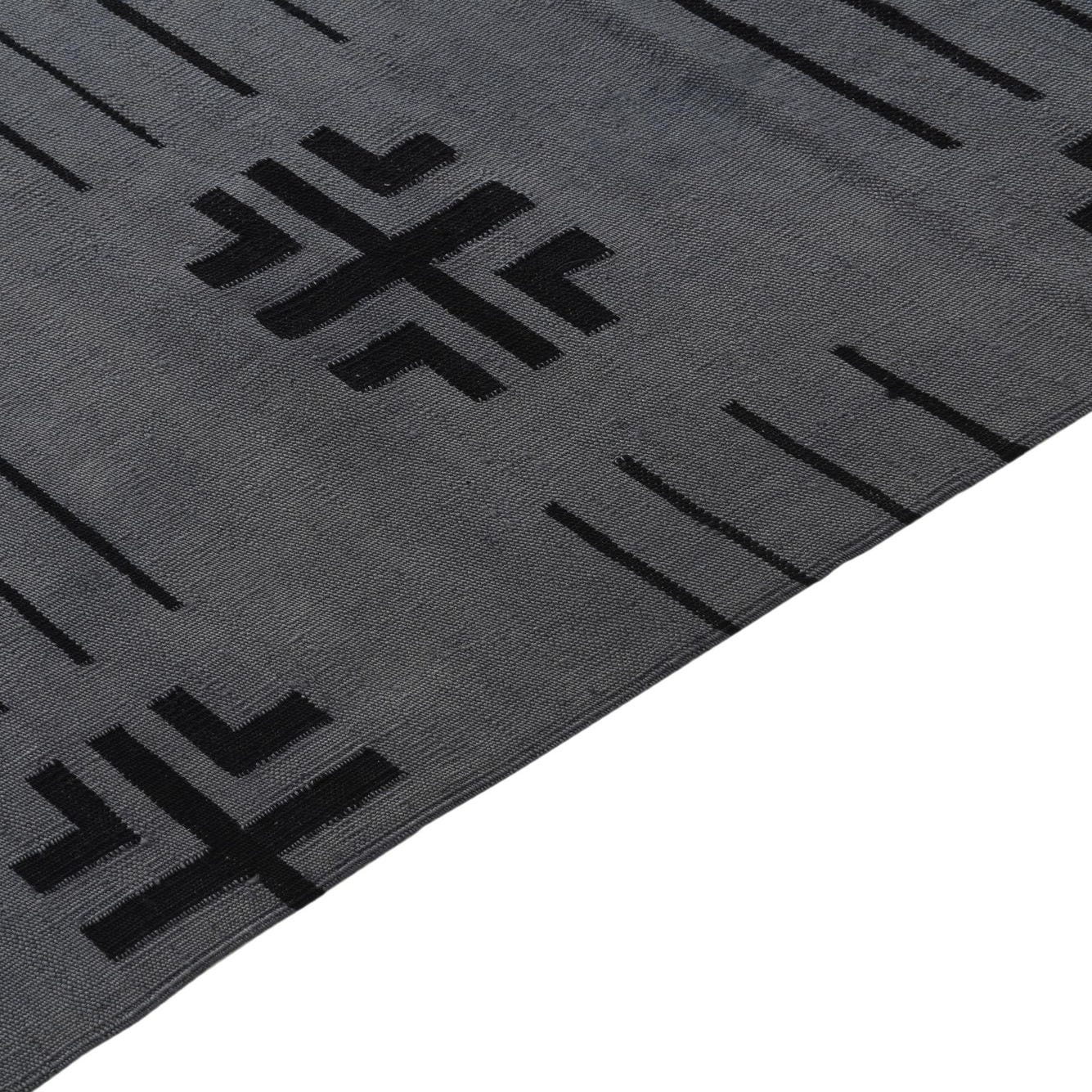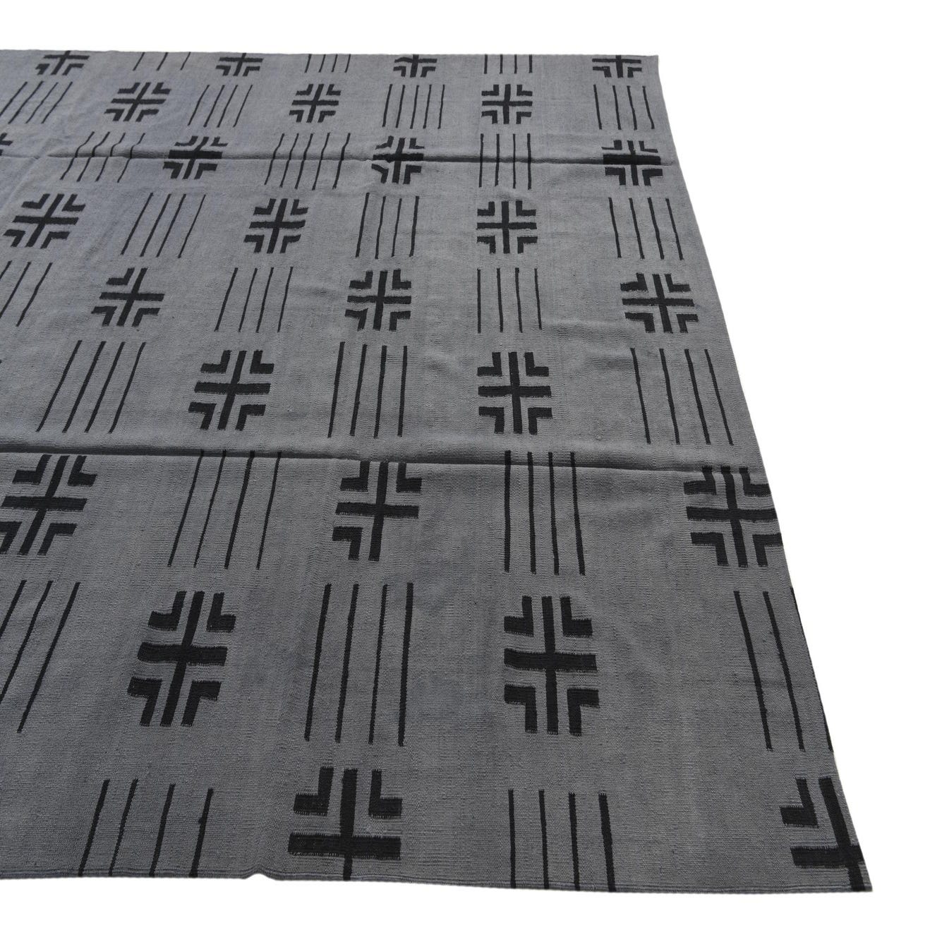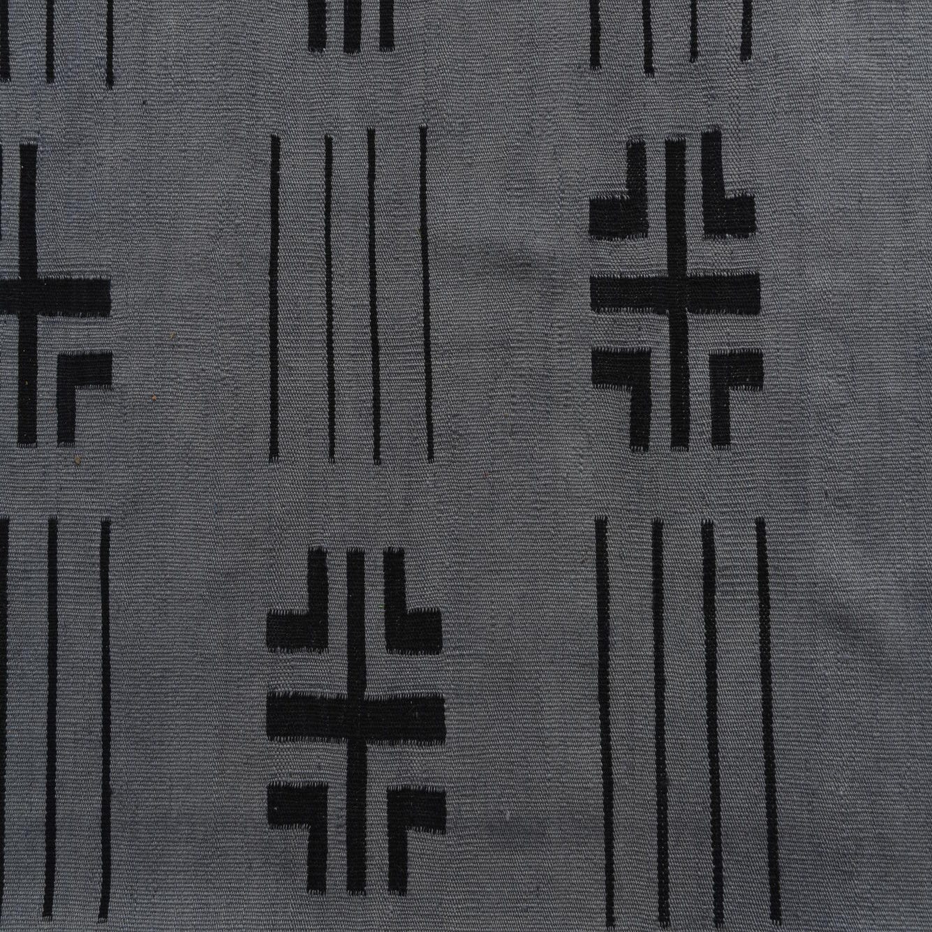 This 8x10 area rug from the Kilim Modern collection showcases a contemporary geometric motif that combines clean lines with traditional design elements. The pattern features a sequence of black linear strokes and cross figures on a grey background, creating an engaging visual rhythm across the handwoven surface. The texture of the 100% wool construction offers a tactile experience that highlights the craftsmanship of the rug.