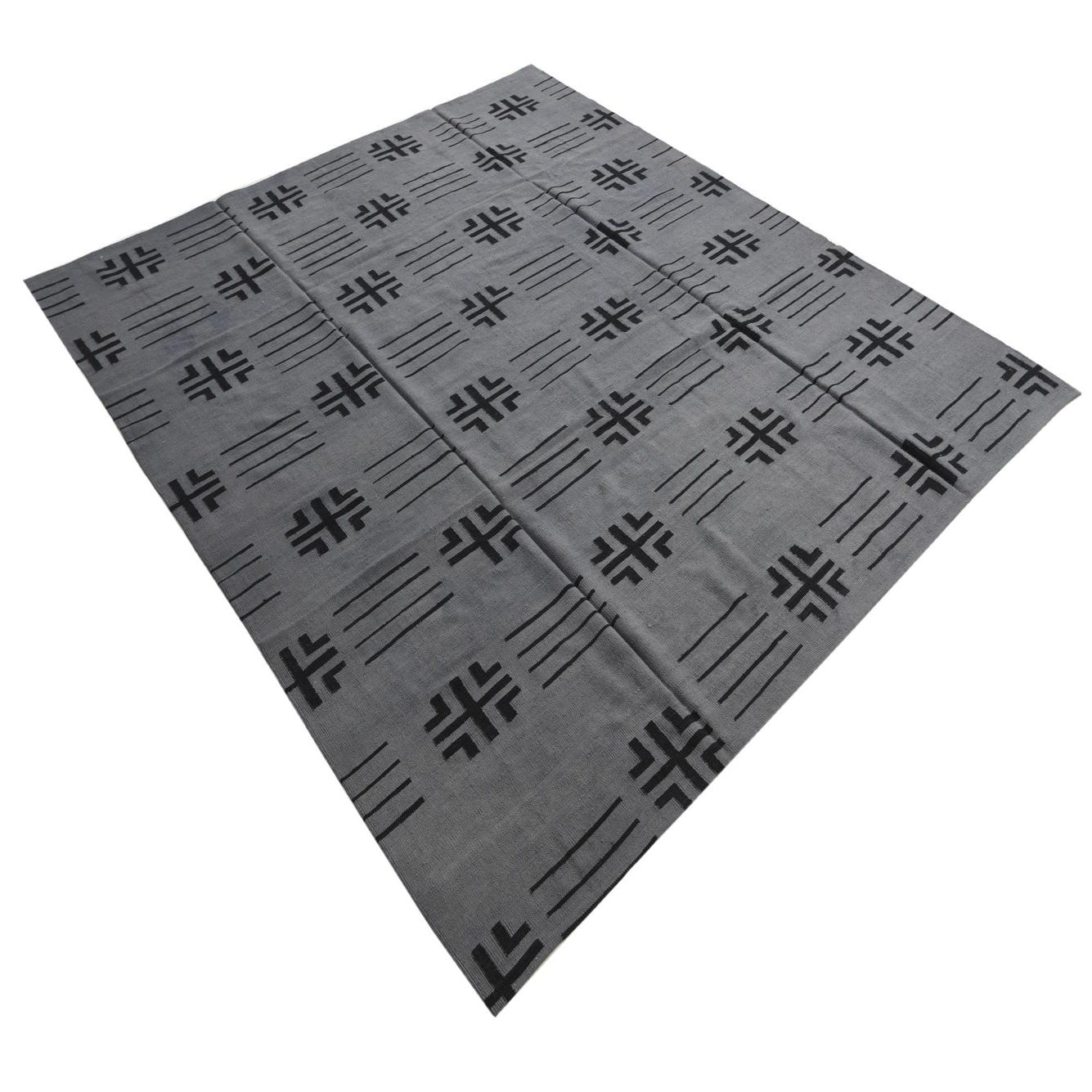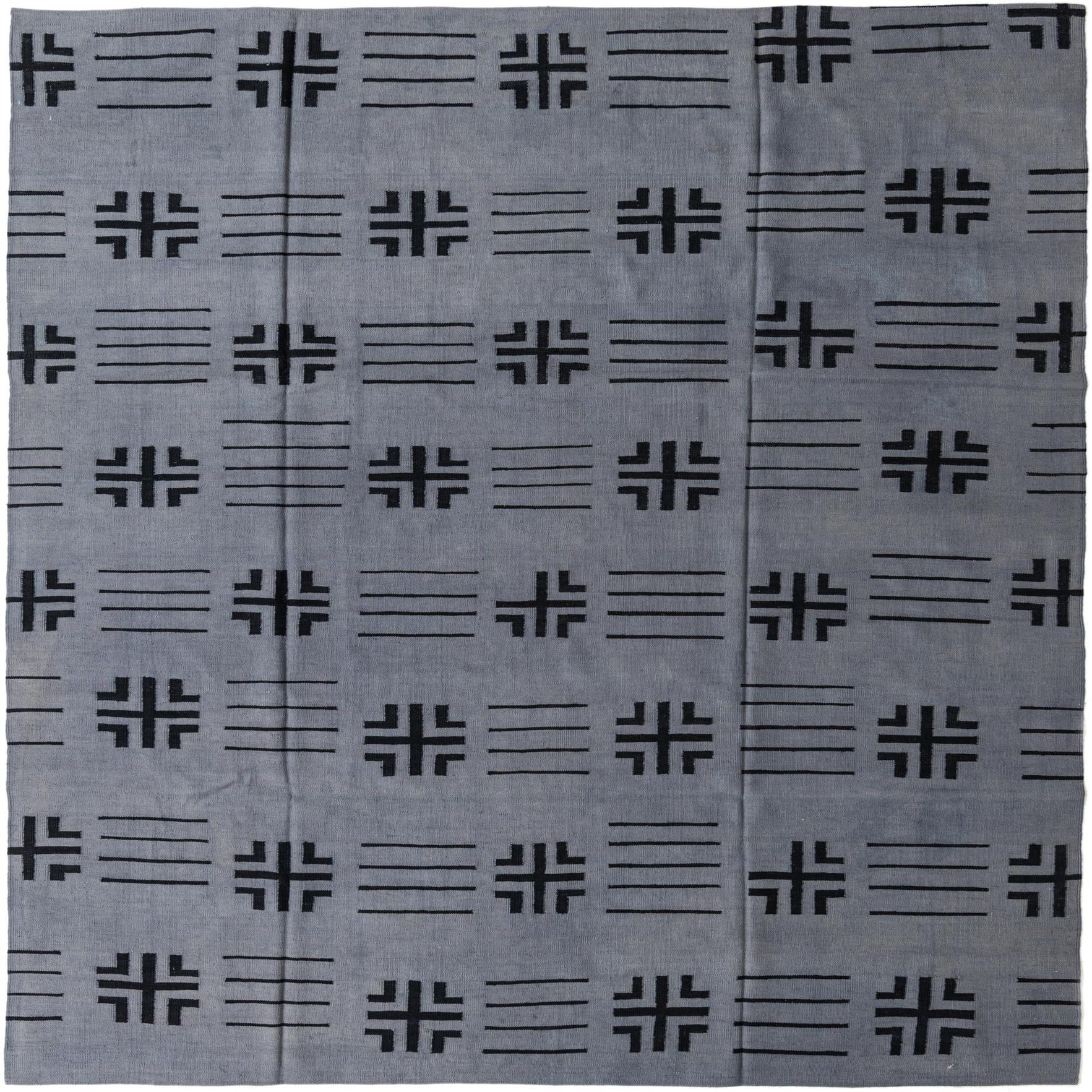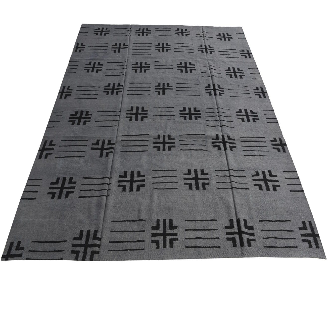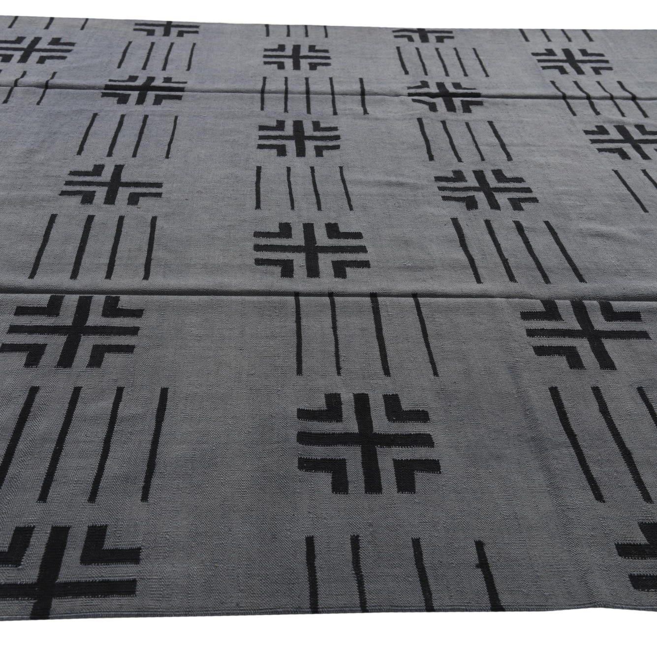 This 8x10 area rug from the Kilim Modern collection showcases a contemporary geometric motif that combines clean lines with traditional design elements. The pattern features a sequence of black linear strokes and cross figures on a grey background, creating an engaging visual rhythm across the handwoven surface. The texture of the 100% wool construction offers a tactile experience that highlights the craftsmanship of the rug.