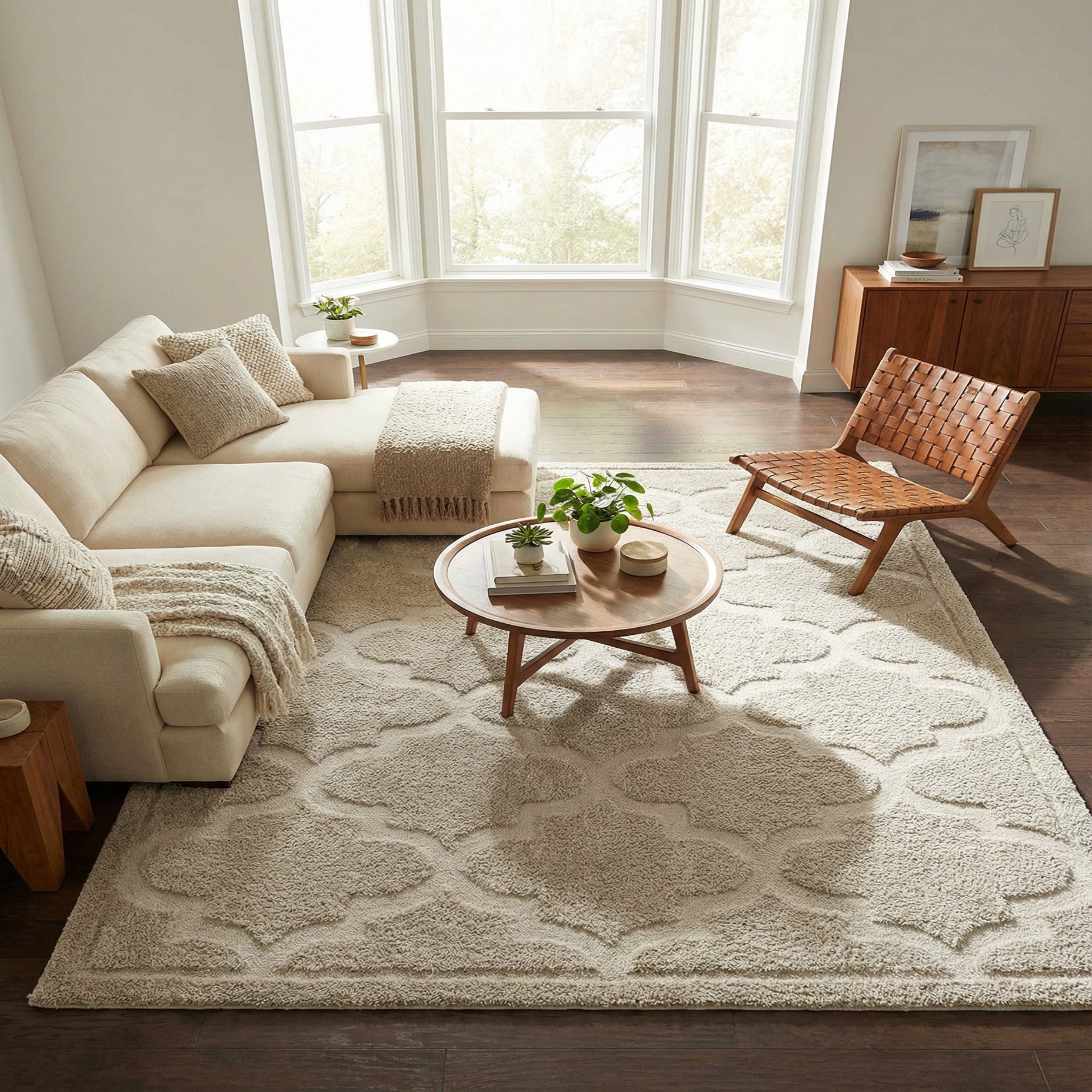 This piece anchors a seating area beautifully—place it under a sofa and coffee table or let it define a cozy bedroom vignette. It pairs well with cool neutrals, warm wood tones, navy or charcoal accents, and soft pastels, fitting transitional, Scandinavian, and modern coastal interiors. Use it to soften hardwood floors, layer in a living room, or add warmth to a reading nook.