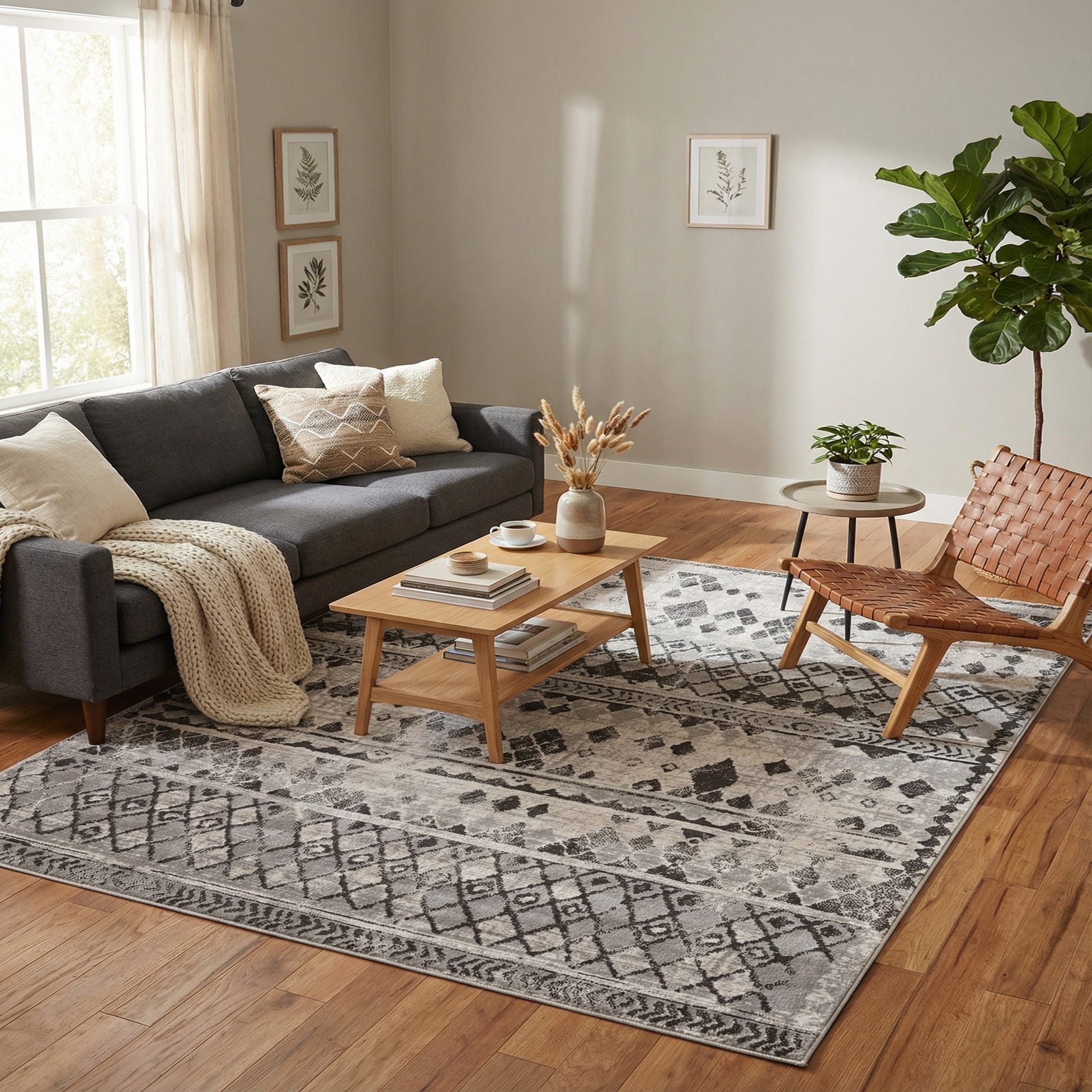 The rug's construction makes it both stain-resistant and shed-free, lending itself to high-traffic areas while maintaining its appearance over time. The textures within the rug provide a plush feel underfoot, contributing to the overall comfort of the space it occupies.