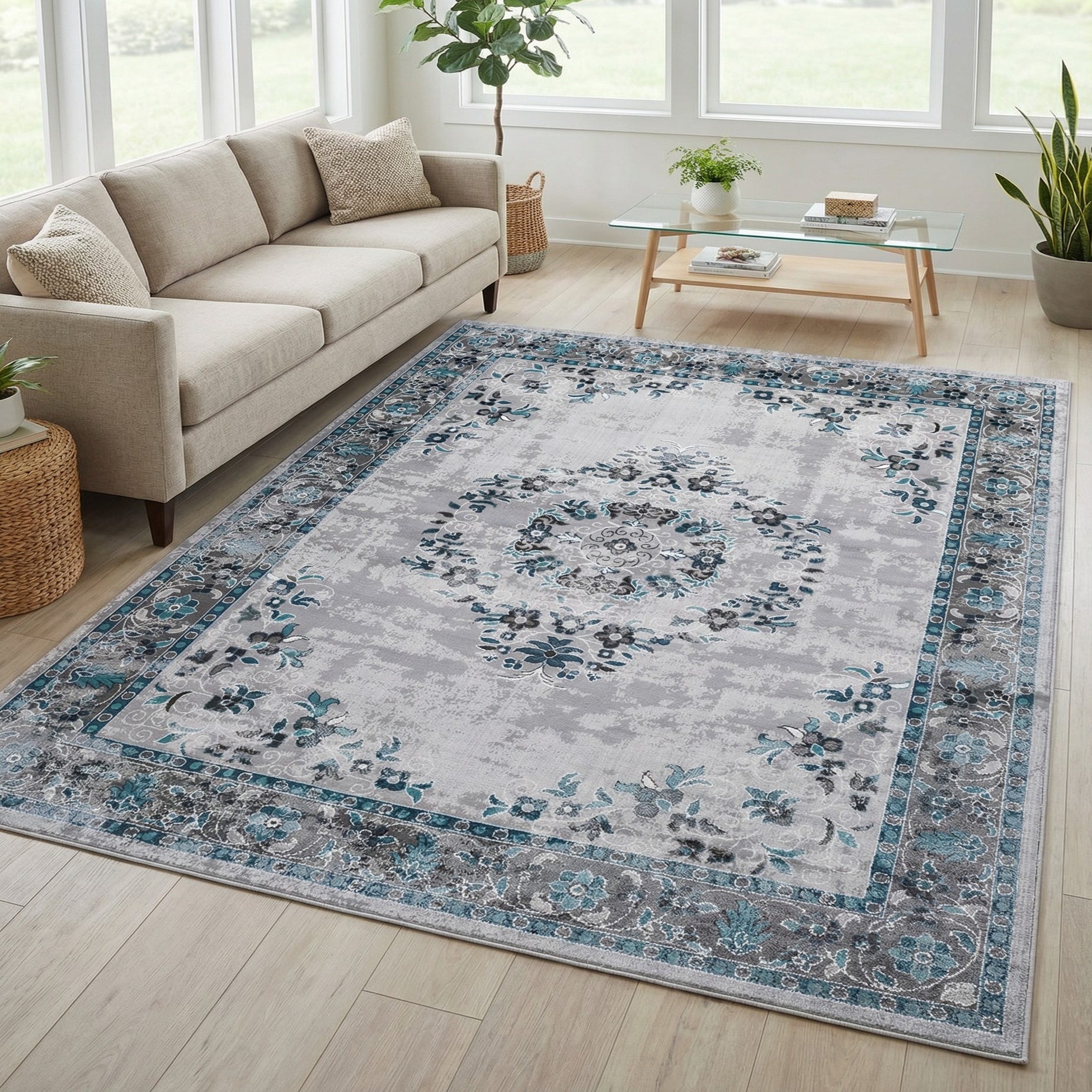 A traditional medallion layout anchors a softly distressed field on a gray background, with scrolling floral motifs circling a central ornament and an ornate floral border. Shades of blue and ivory trace the petals and vines, creating clear, cool contrast against the neutral ground. Machine-made of 100% polypropylene, the rug has a low, dense pile with a smooth, slightly plush hand and a subtle, low-sheen finish that highlights the pattern without overpowering a room.
