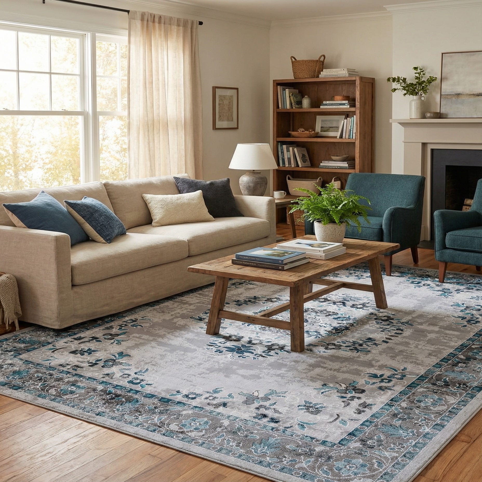 This design fits a range of interiors: place it beneath a living room seating group to anchor a sofa and coffee table, tuck it partly under a dining set to define the dining area, or use it in a bedroom to add layered texture at the foot of the bed. The gray field and blue accents pair well with light or medium wood floors, cool-toned upholstery, or navy and ivory accessories for a calm, coordinated look.