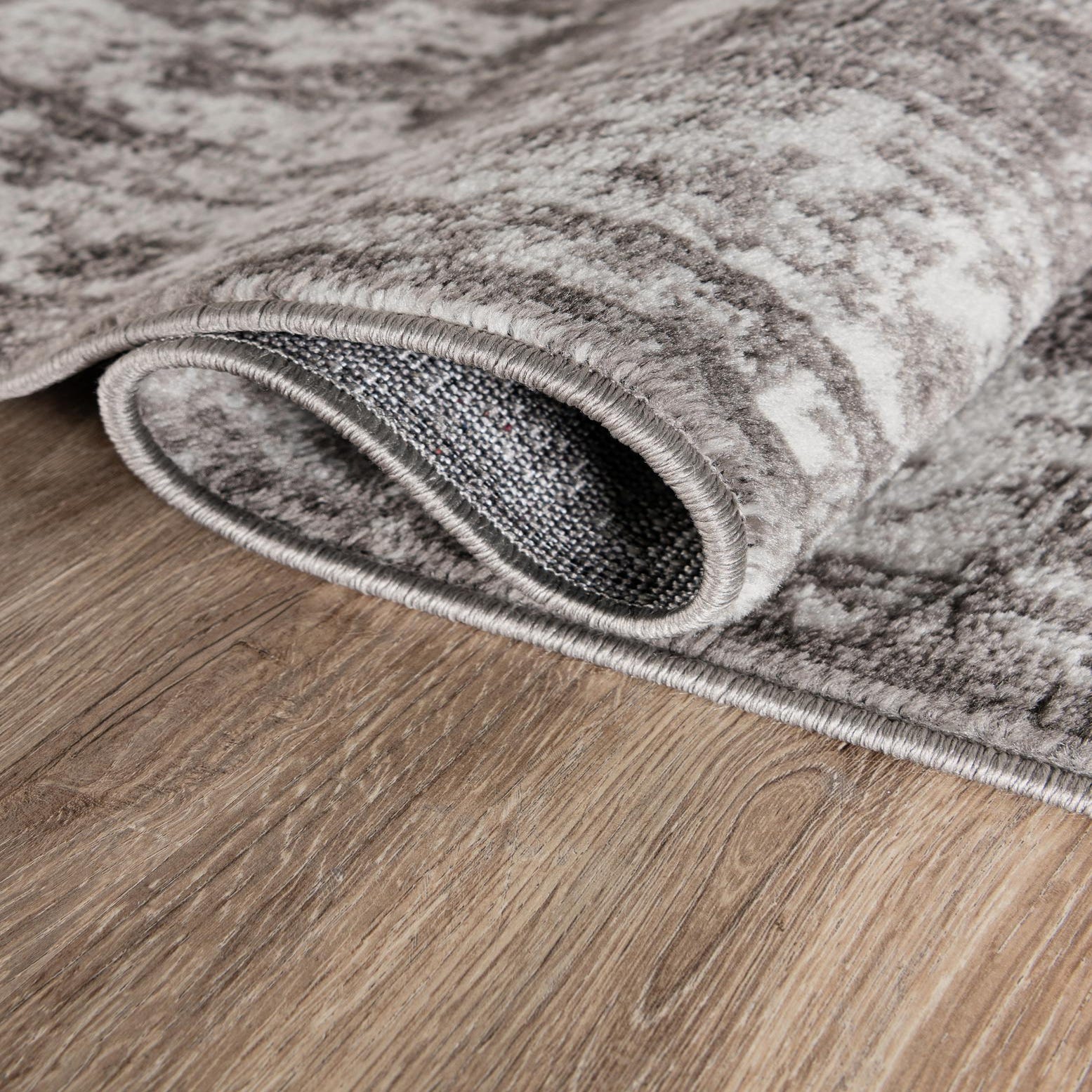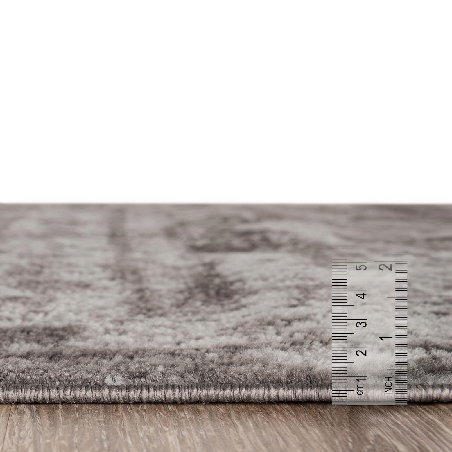 A softened, vintage-inspired medallion design gives this rug a timeless presence. An ornate central motif and coordinating border are rendered in muted beige against a gray background, with a distressed finish that softens the pattern edges and creates visual depth. The overall look blends traditional ornament with a worn-in, understated aesthetic that pairs easily with both classic and contemporary furnishings.