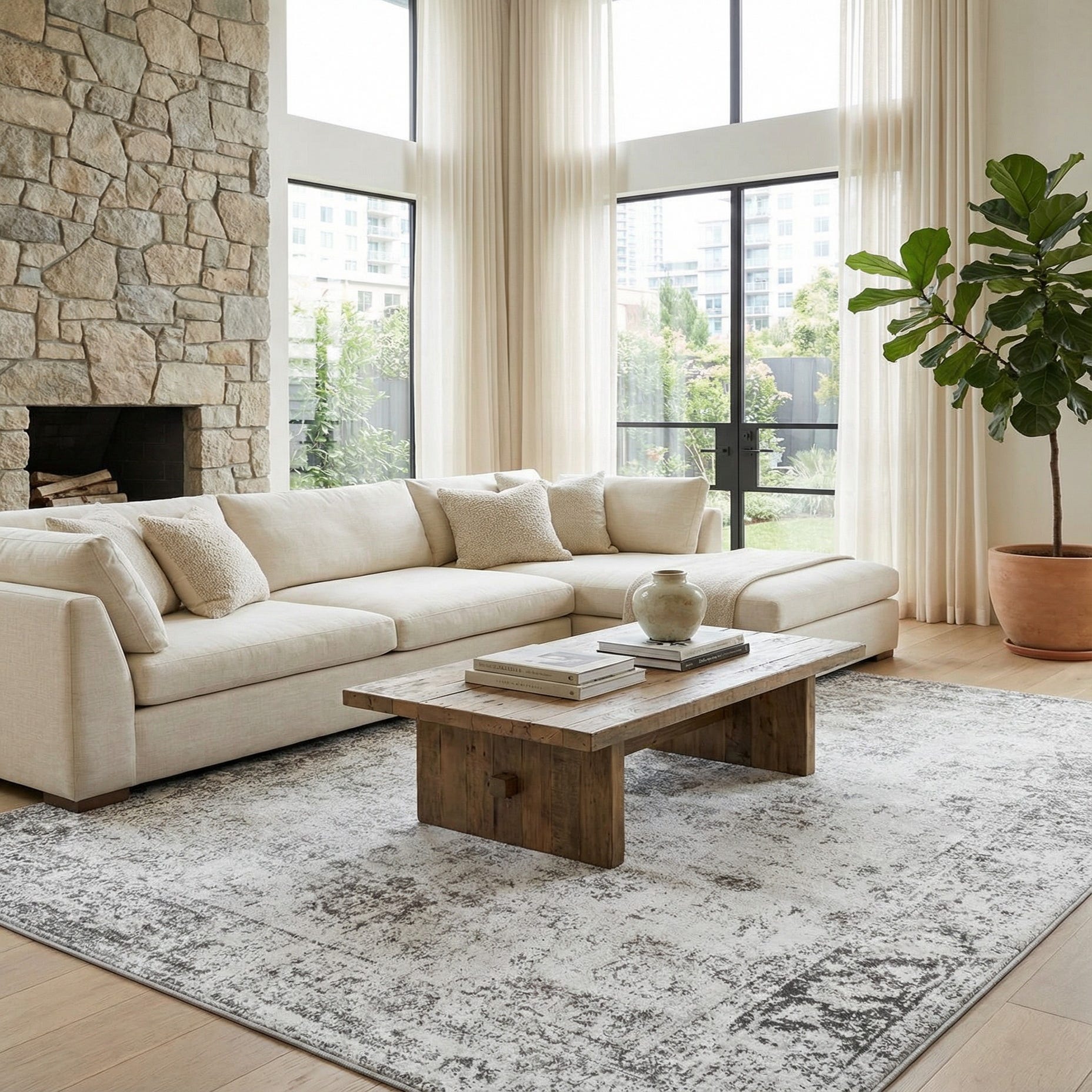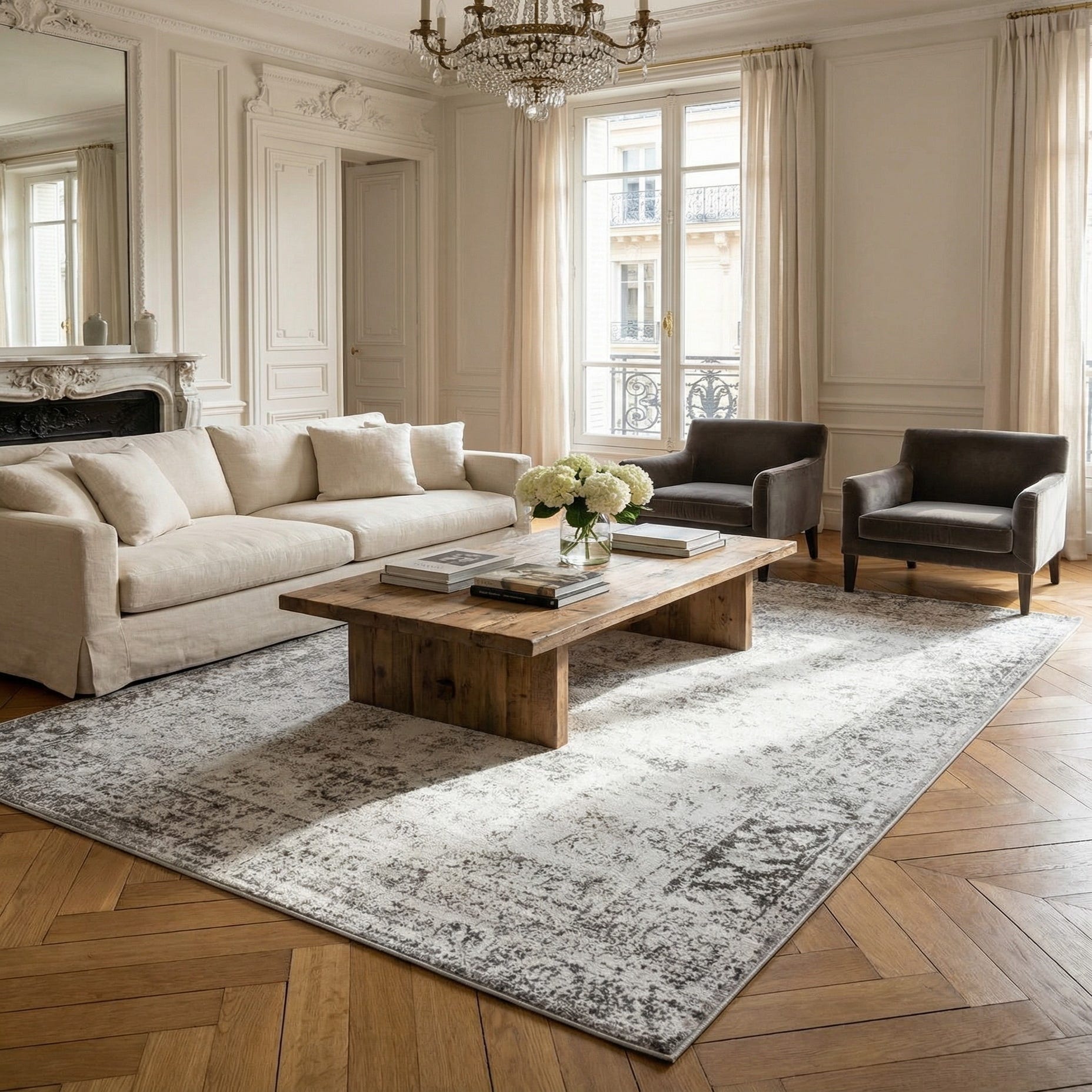 This rug works well in a range of interiors — place it under a sofa and coffee table to anchor a contemporary living room, layer it beneath a wood dining table for a relaxed transitional vibe, or let it soften a modern bedroom with neutral bedding. It pairs especially well with cool-toned furnishings, warm wood accents, and minimalist decor where the gentle pattern can add texture without overwhelming the space.