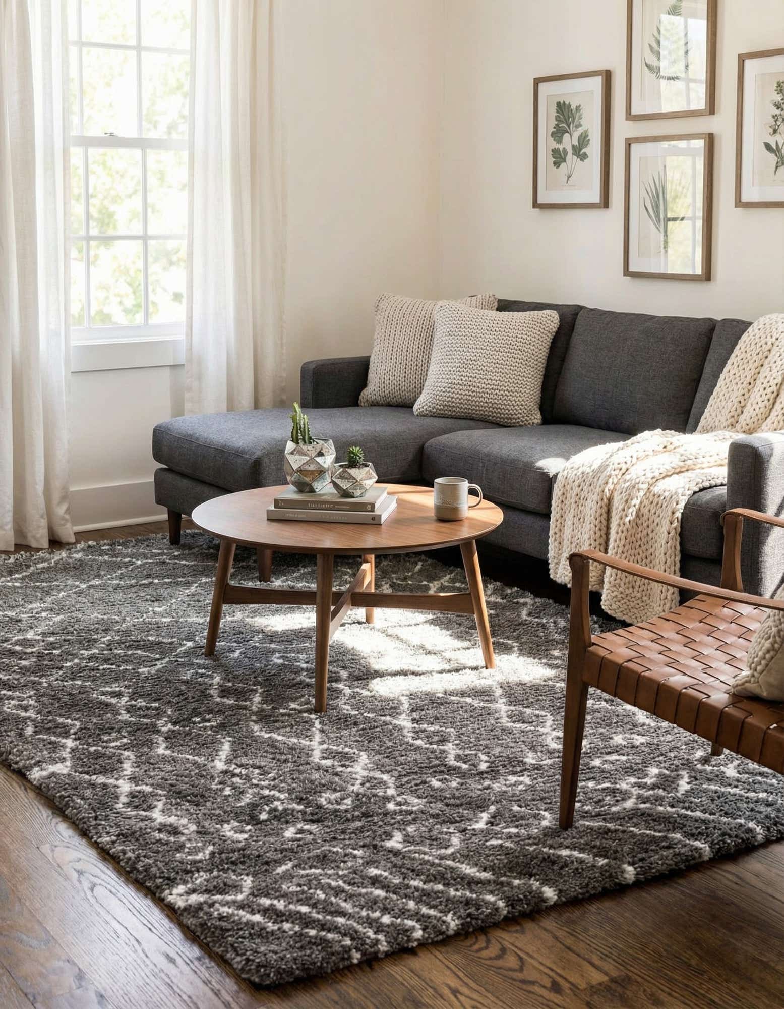 A soft 8x10 gray rectangular shag rug with a white Scandinavian tribal trellis pattern, perfect for a modern living room.