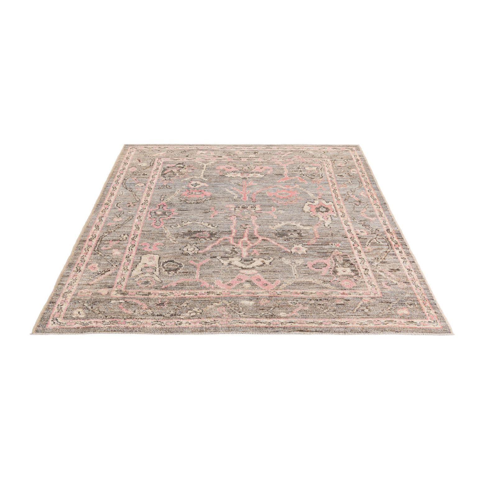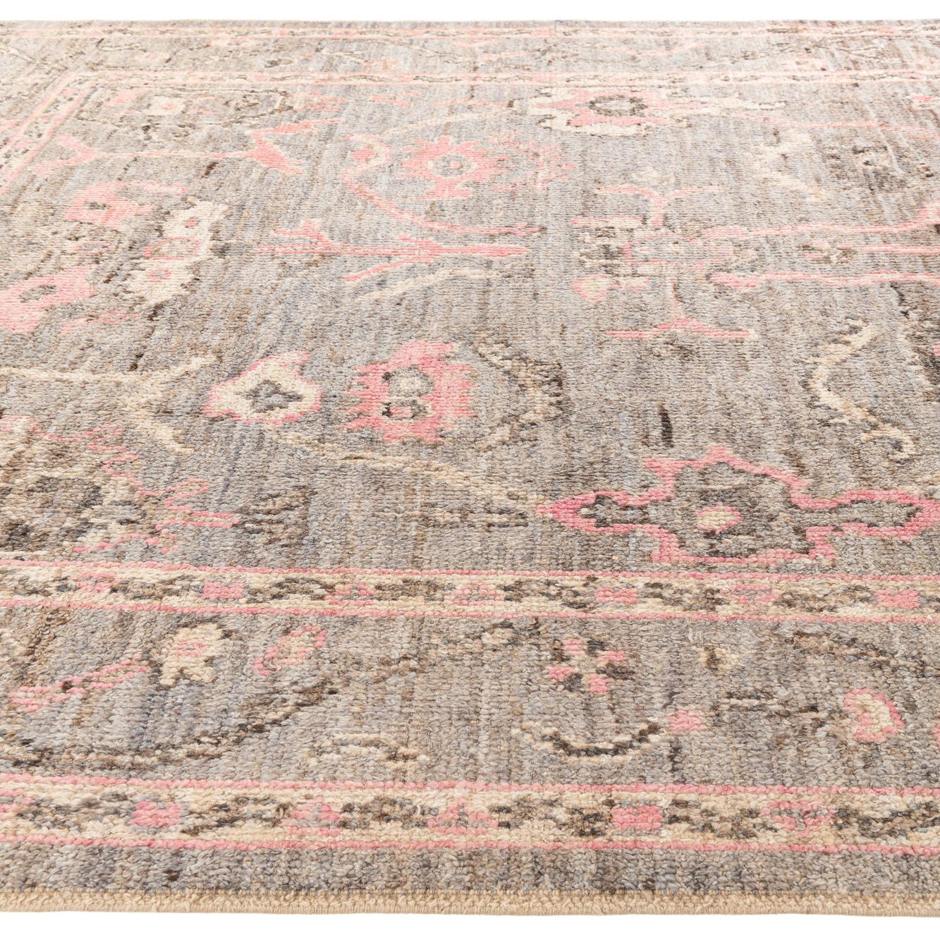 Primary color is Gray. Colors in this rug include: Gray, Brown, Ivory, Pink.