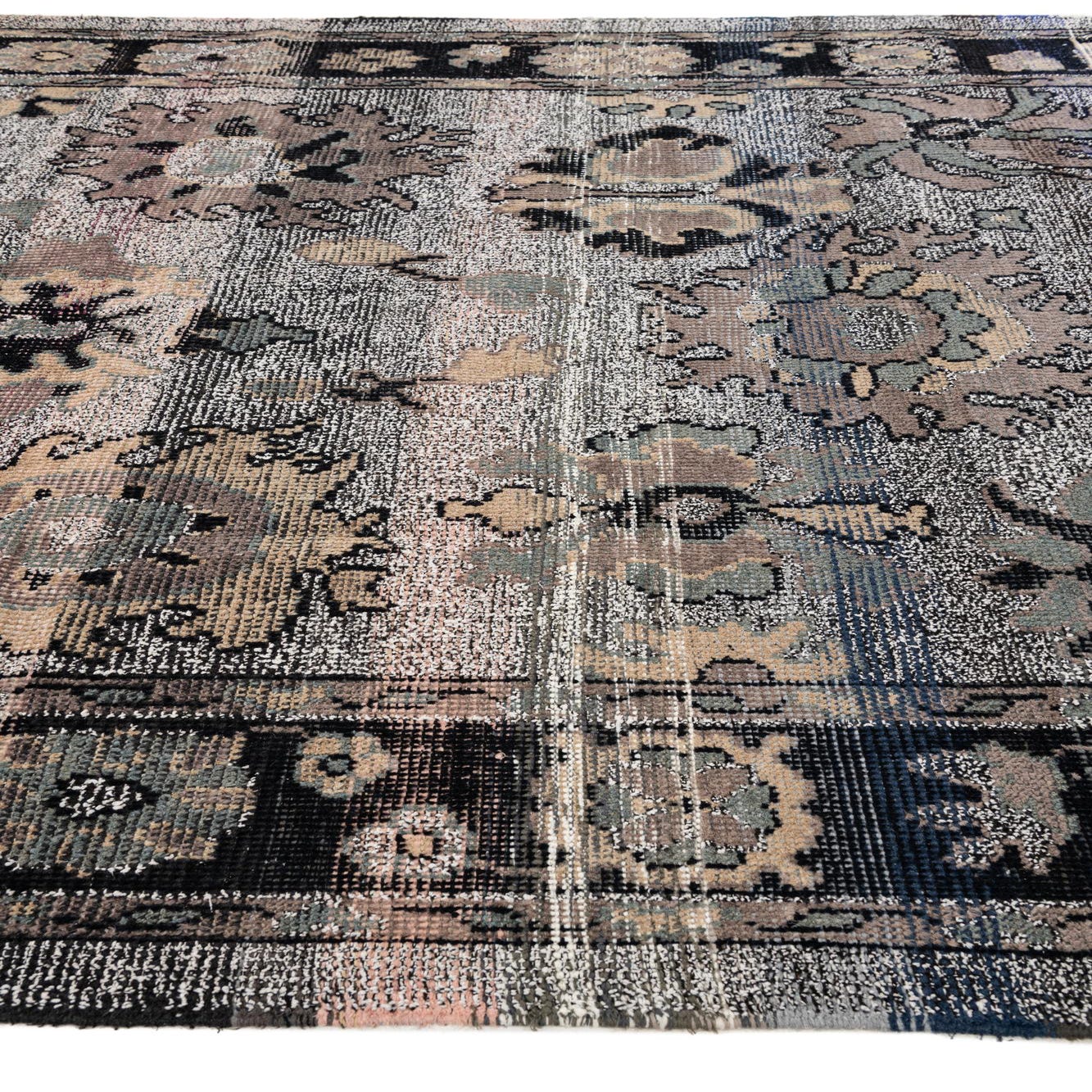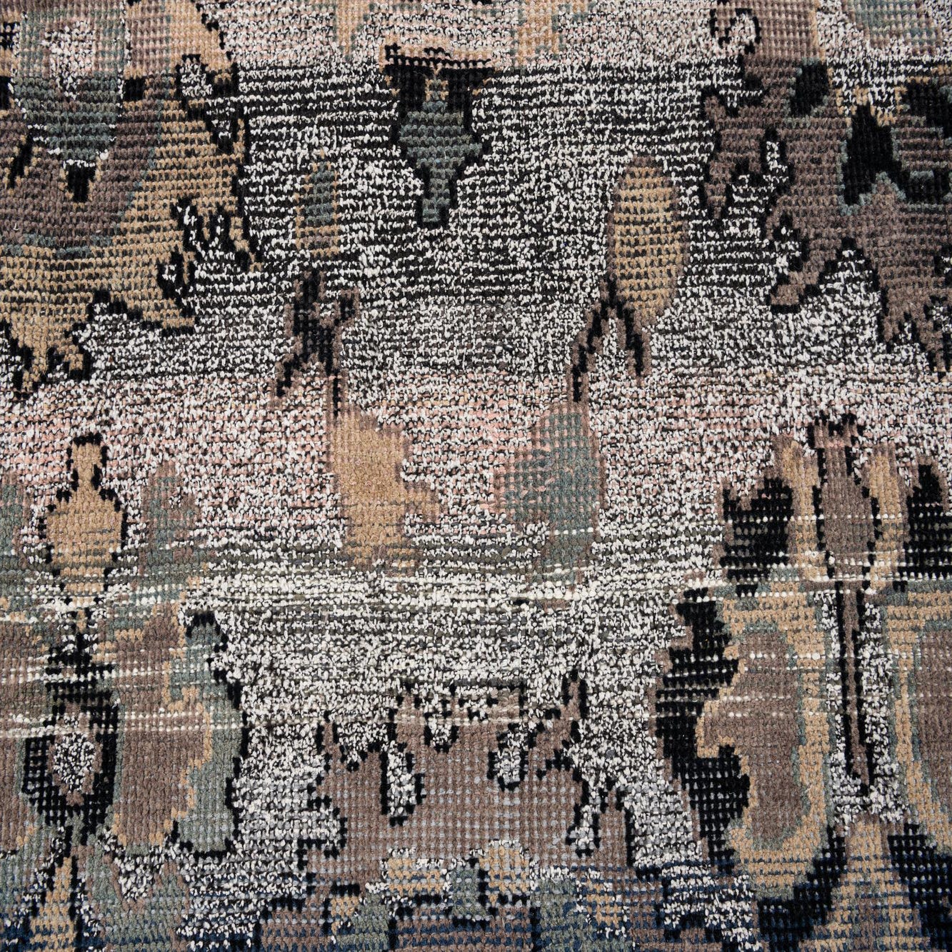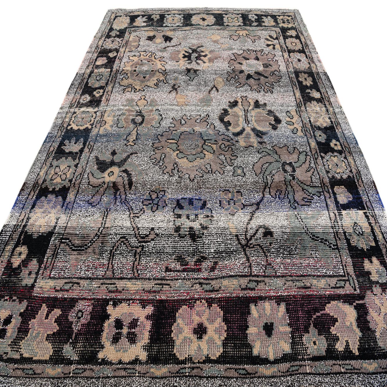 Primary color is Gray. Colors in this rug include: Gray, Beige, Black, Brown, Green, Violet, Ivory.
