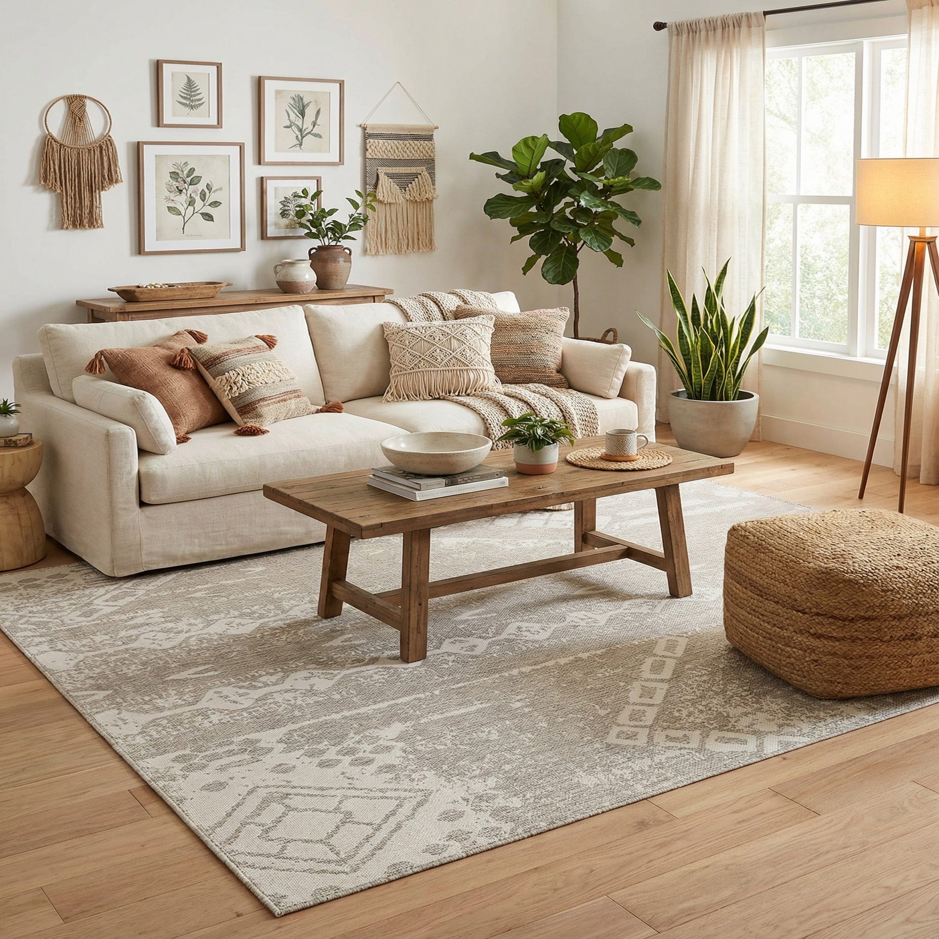 Due to its color palette and design, the rug is a fitting complement to a diverse range of decor styles. It pairs exceptionally well with minimalist and modern decor, providing a soft contrast and a touch of warmth without overwhelming the space. In a bohemian-themed setting, this rug can seamlessly integrate with eclectic furnishings and natural textures, enhancing the overall ambience.