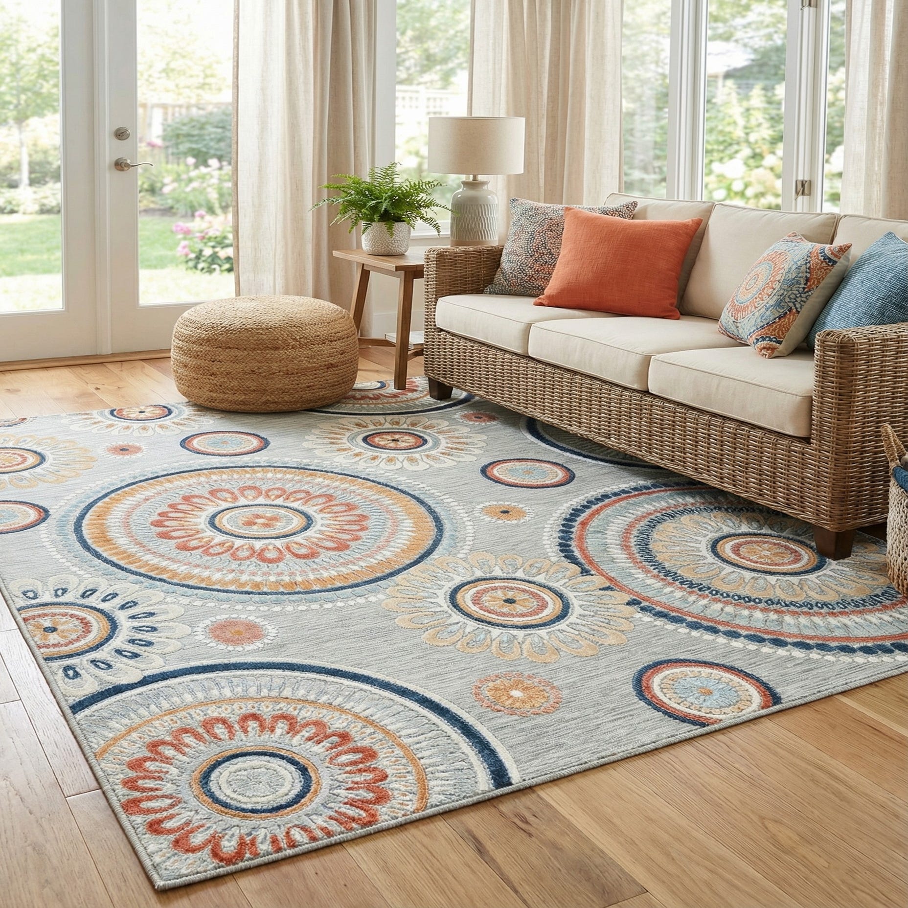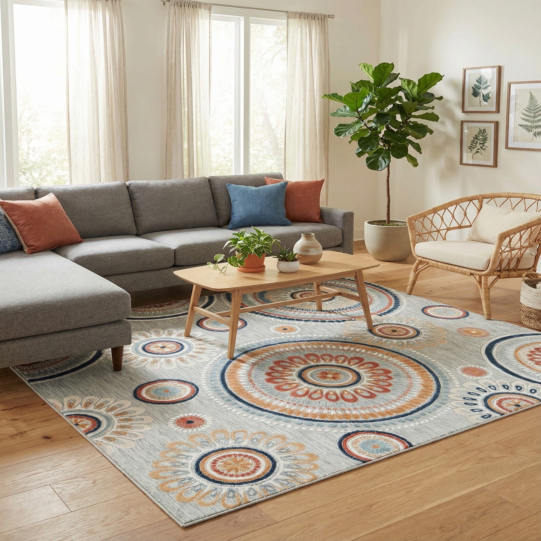 An 8x10 gray rectangular rug with a modern abstract pattern of large and small colorful medallions in coral, blue, orange, and cream.
