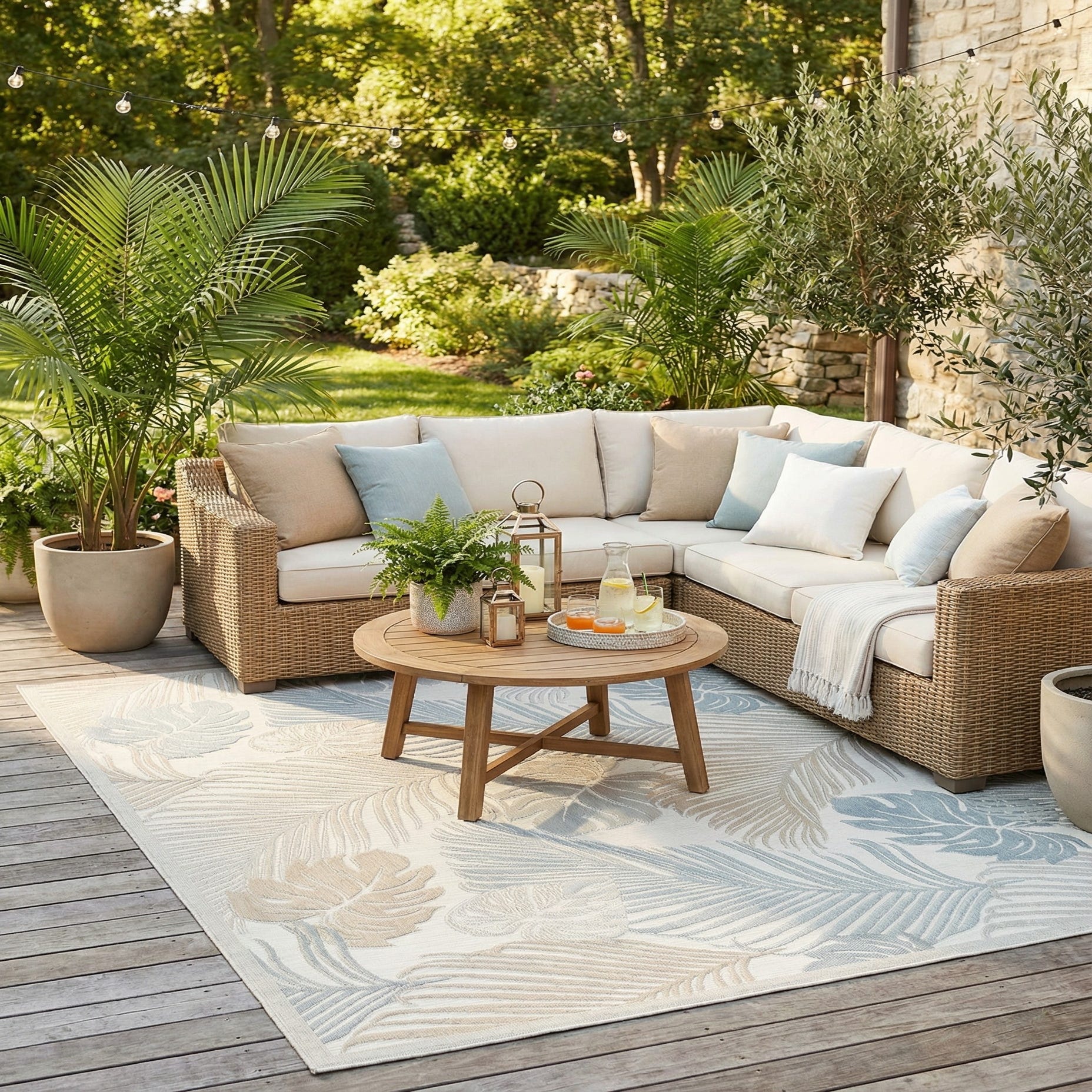 The Outdoor Botanical rug is a sophisticated addition to any outdoor living space, reflecting a keen eye for design with its botanical pattern. This machine-woven 8x10 polypropylene rug showcases a selection of leaf silhouettes in a tasteful array of gray, ivory, and beige tones on a serene gray background. The combination of colors ensures versatility, allowing this rug to complement a range of palettes in exterior settings.