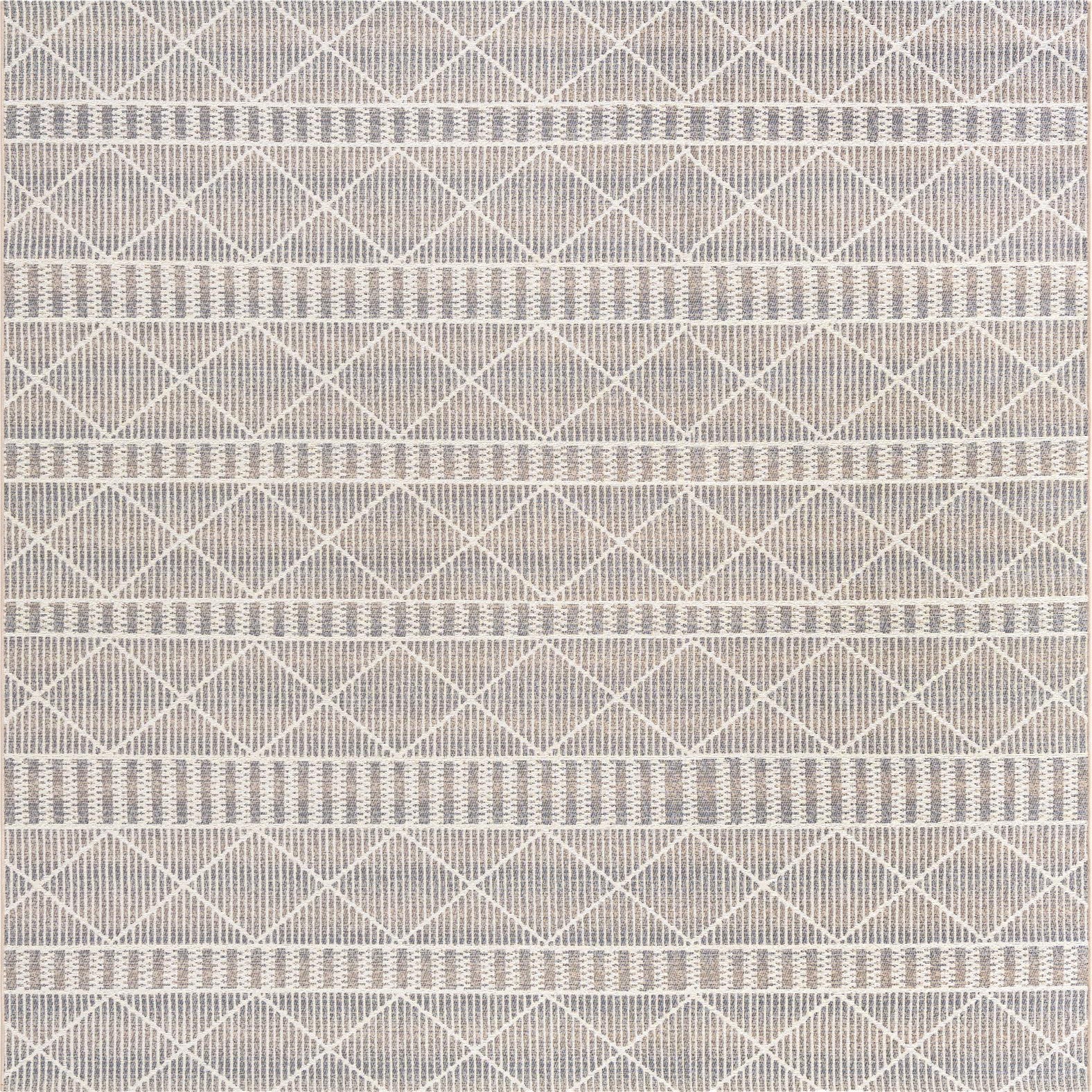 A clean geometric lattice anchors this low-profile rug, with crisp ivory lines forming diamond motifs set against a warm gray background. Narrow beige and ivory banding runs horizontally, adding a subtle stripe contrast that gives the surface visual depth. The pile is low and slightly ribbed where the pattern is raised, offering a smooth, textured feel underfoot that holds its shape without extra loft.