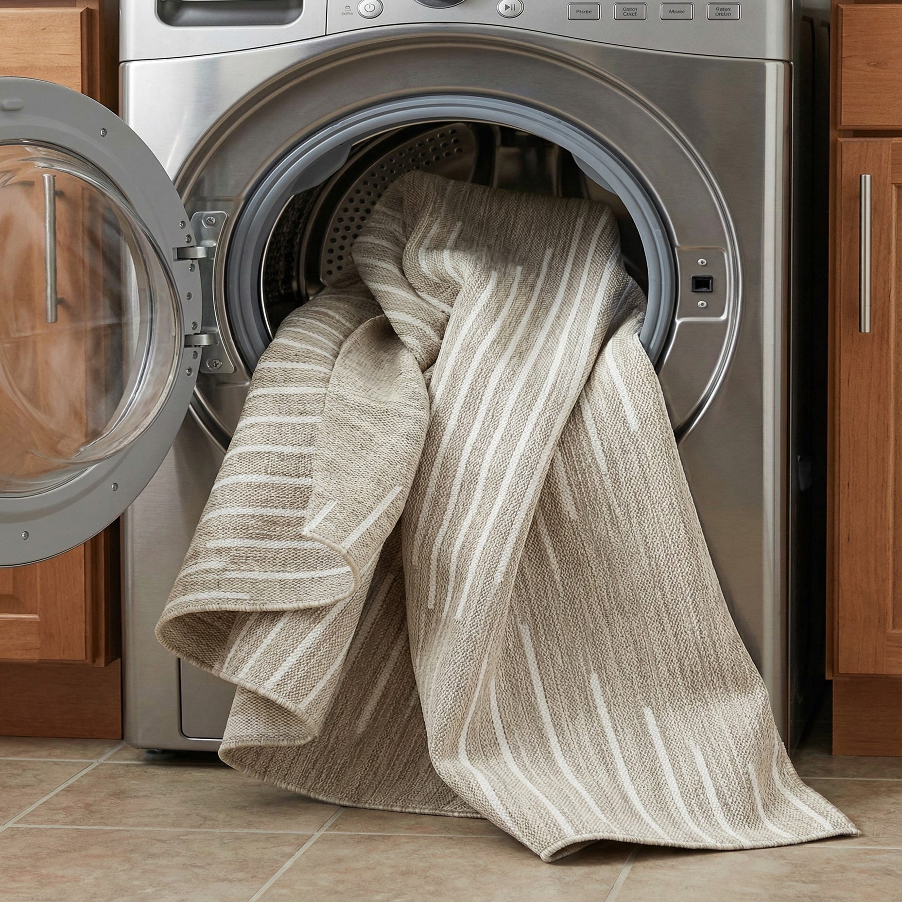 This piece works well on a covered patio or sunroom as an easygoing anchor, and also complements modern living rooms, dining areas, or minimalist bedrooms seeking a neutral foundation with contemporary patterning. Pair it with light wood furnishings and linen textiles for a Scandinavian-inspired look, or combine with streamlined metal and glass pieces for a more urban modern palette.