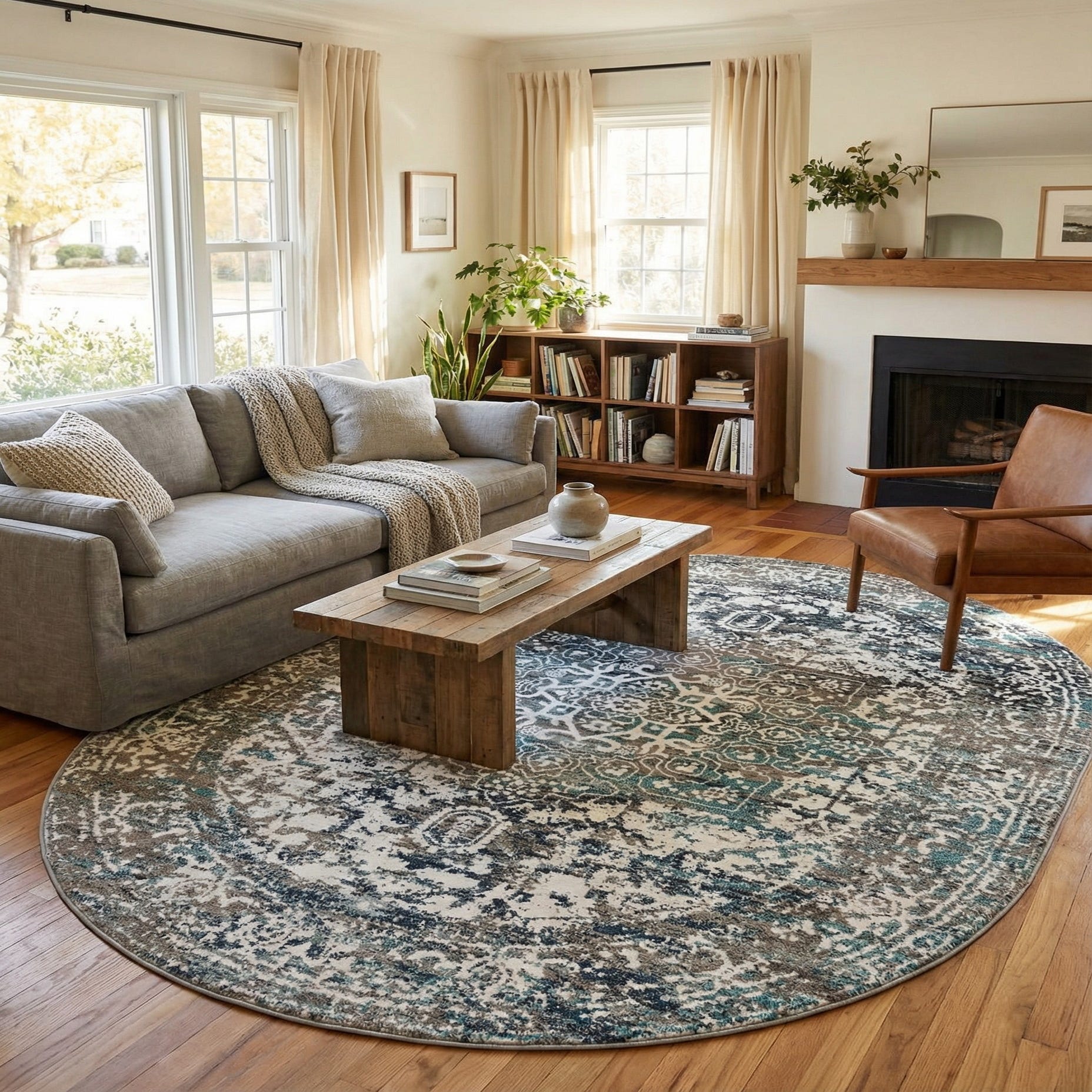 Primary color is Gray. Colors in this rug include: Gray, Blue, Ivory, Navy Blue.
