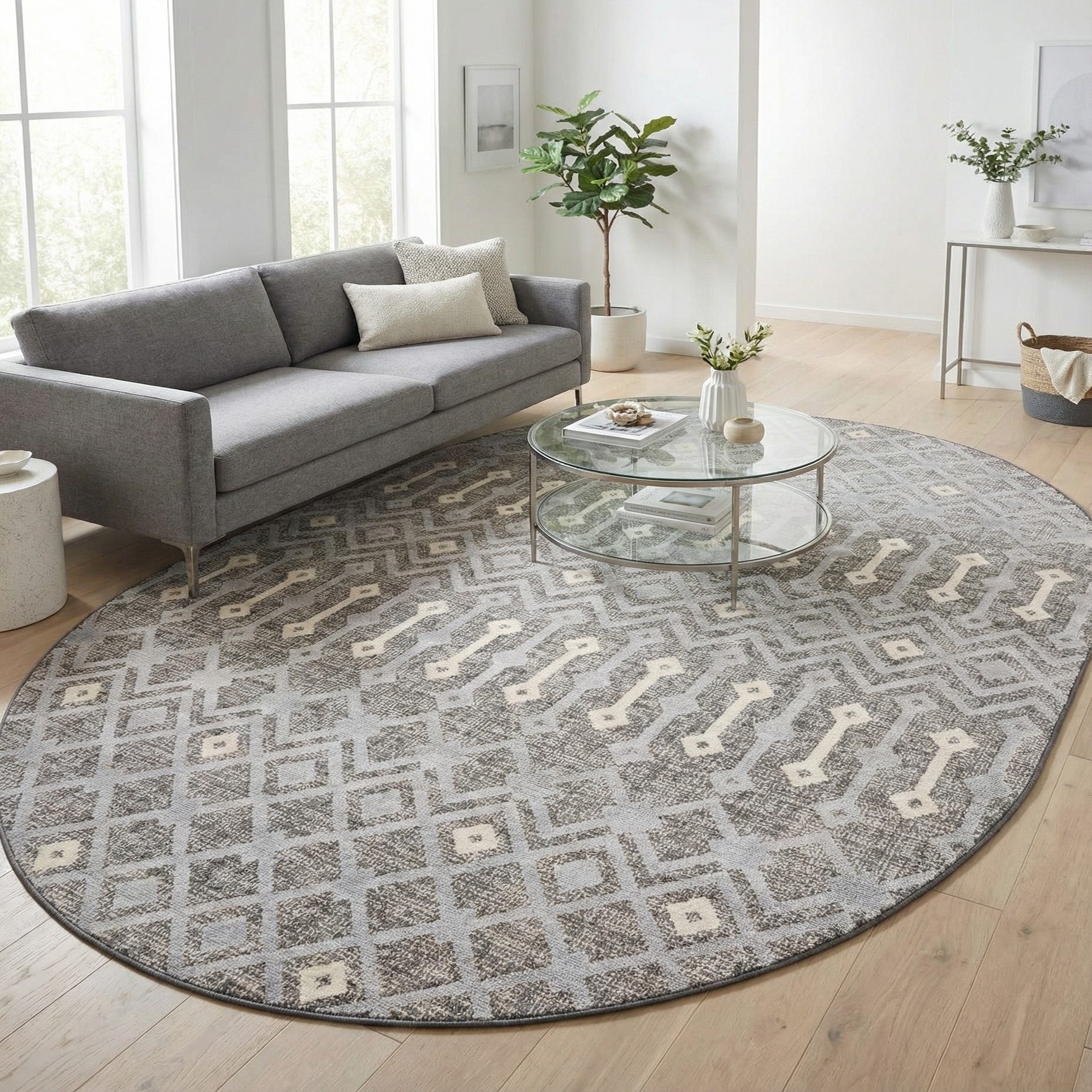The oval silhouette works especially well where softer lines are desired — try it beneath a round dining table, centered in a seating area to anchor a conversation grouping, or placed in a bedroom to add pattern without overwhelming the space. Its neutral palette and geometric styling pair easily with contemporary, transitional, Scandinavian, or modern farmhouse interiors, and it layers well with natural woods, light leathers, and muted textiles.
