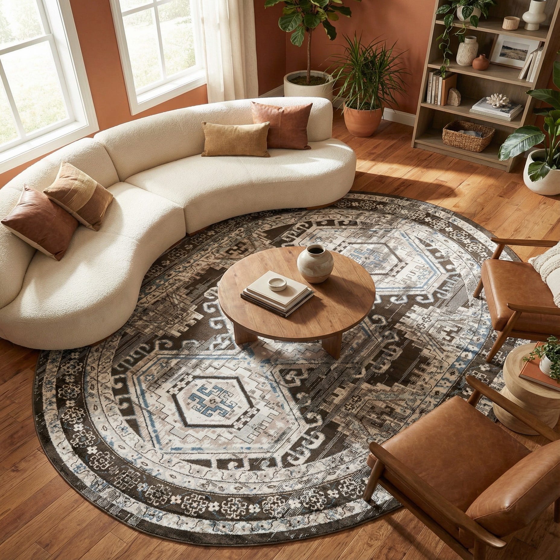Machine made from 100% polypropylene, the rug has a low-profile pile with a smooth, slightly cushioned hand that feels comfortable underfoot and keeps the pattern crisp. The oval shape is ideal for anchoring a round dining table, defining a cozy seating area in the living room, or softening a bedroom layout. It works well with neutral palettes, coastal or farmhouse schemes, and eclectic interiors that mix warm woods and metal accents.