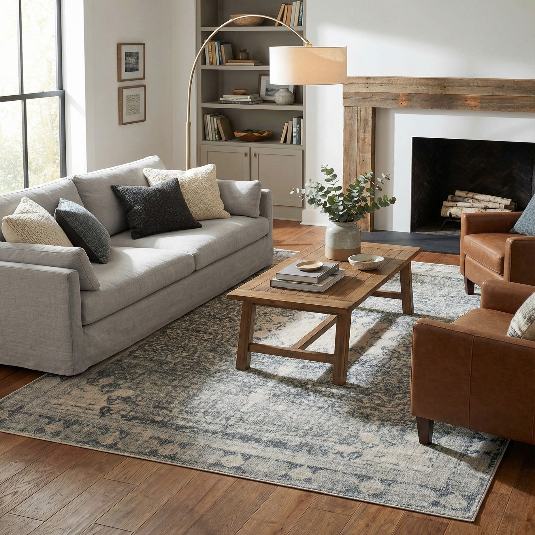 A softly distressed medallion pattern floats across a gray ground, with ivory and beige accents that give the design a lived-in, layered look. The faded border and intricate motif work create a vintage-inspired vibe without heavy contrast, while the space-dyed yarn adds subtle tonal variation across the surface. Run your hand over the low-profile pile and you’ll notice a smooth, slightly cushioned texture that feels comfortable underfoot and shows the pattern with gentle depth.
