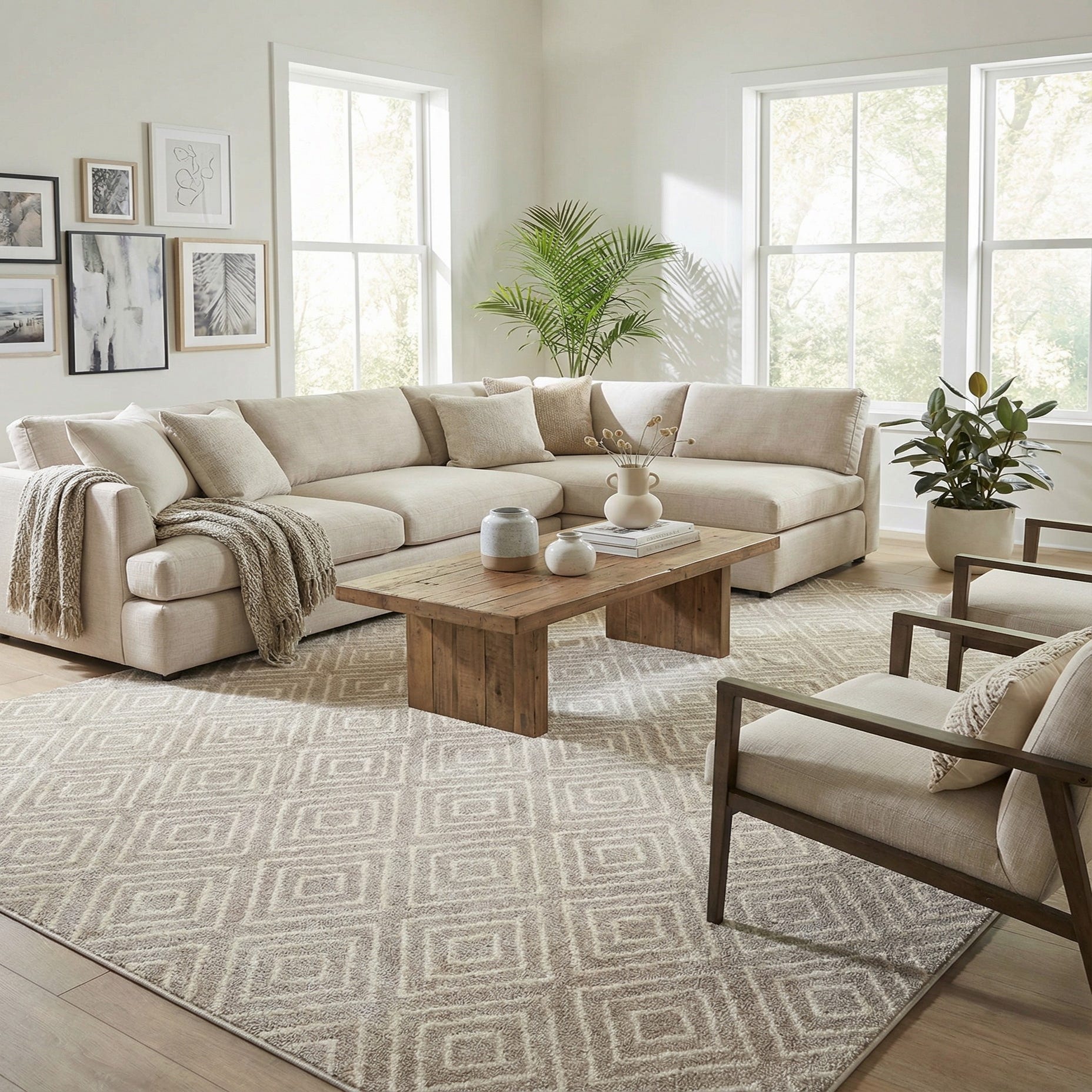 An 8x10 rectangular gray modern rug with a repeating diamond pattern, suitable for indoor or outdoor use.