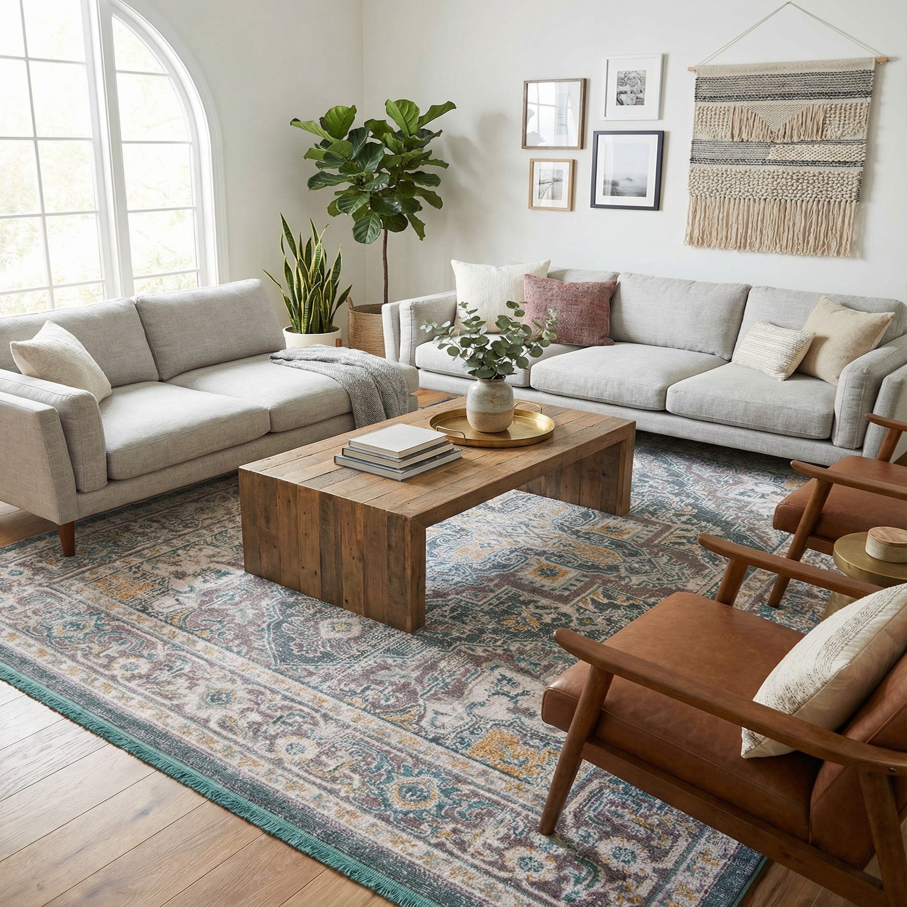 The pile is low to medium and has a smooth, slightly cushioned surface that feels soft underfoot while maintaining a structured, even texture. It anchors a living area beneath a sofa and coffee table, provides a warm foundation under a dining table, or adds pattern and color to a bedroom or home office. Pair it with neutral upholstery and brass or wood finishes for a transitional look, layer it beneath mid-century modern furniture to add softness, or use it to introduce subtle color into contemporary and vintage-inspired rooms.