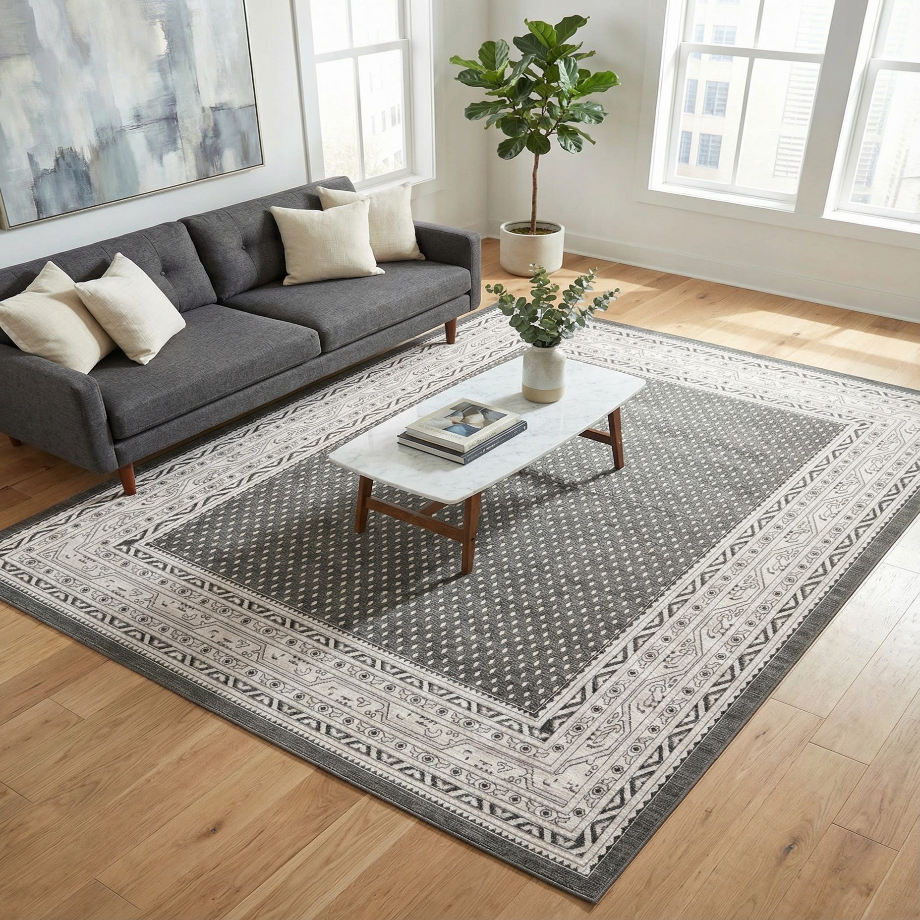 This rug works well in living rooms and family rooms where a neutral foundation is needed to tie seating and accent pieces together, and it also lays flat and low enough for dining areas so chairs move easily. Pair it with light linen upholstery and black metal or matte wood accents for a modern, layered aesthetic, or use it to ground a home office or entryway where the bordered design provides a clear visual frame for the space.