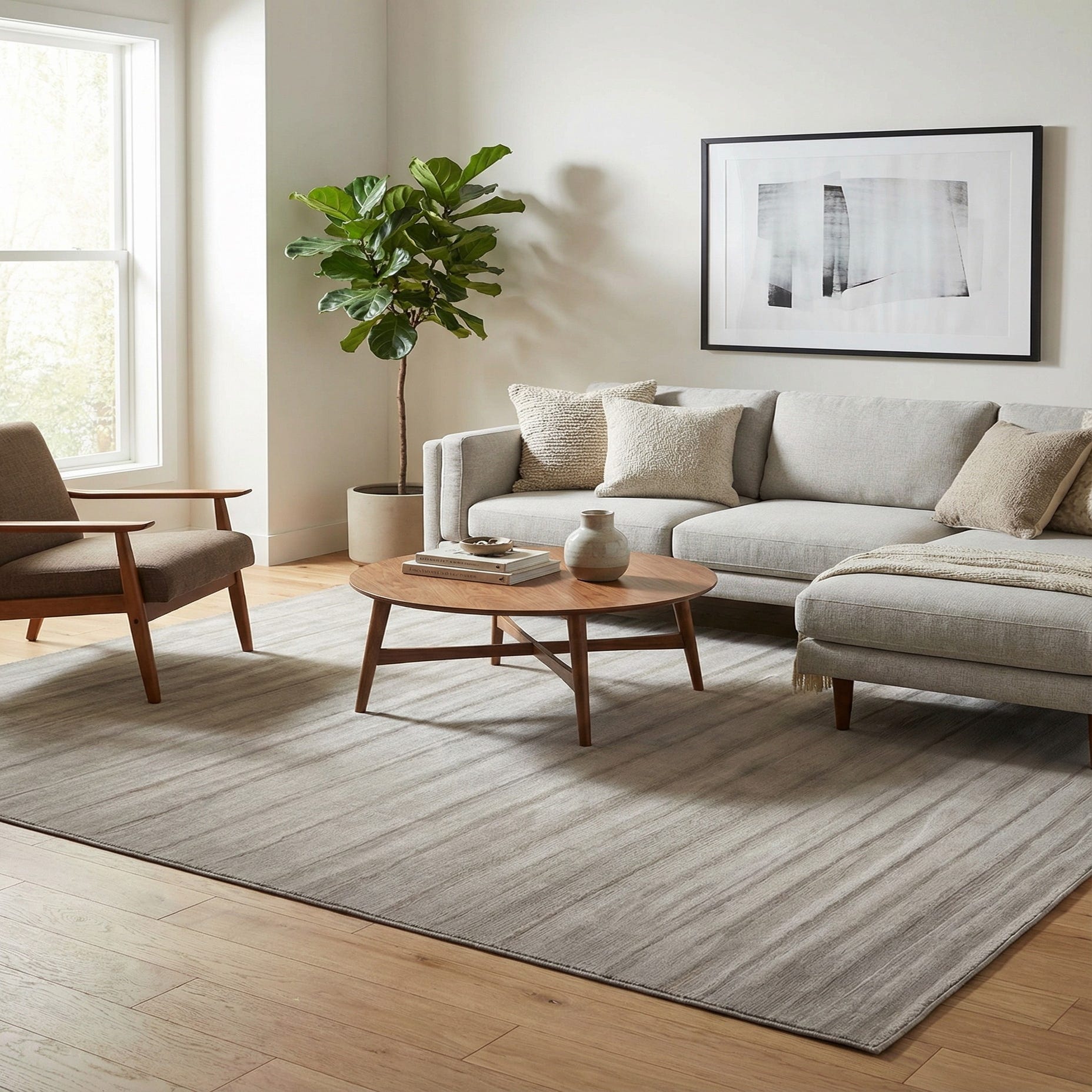 A rectangular 8x10 gray area rug with a subtle striped texture, perfect for a modern living room.