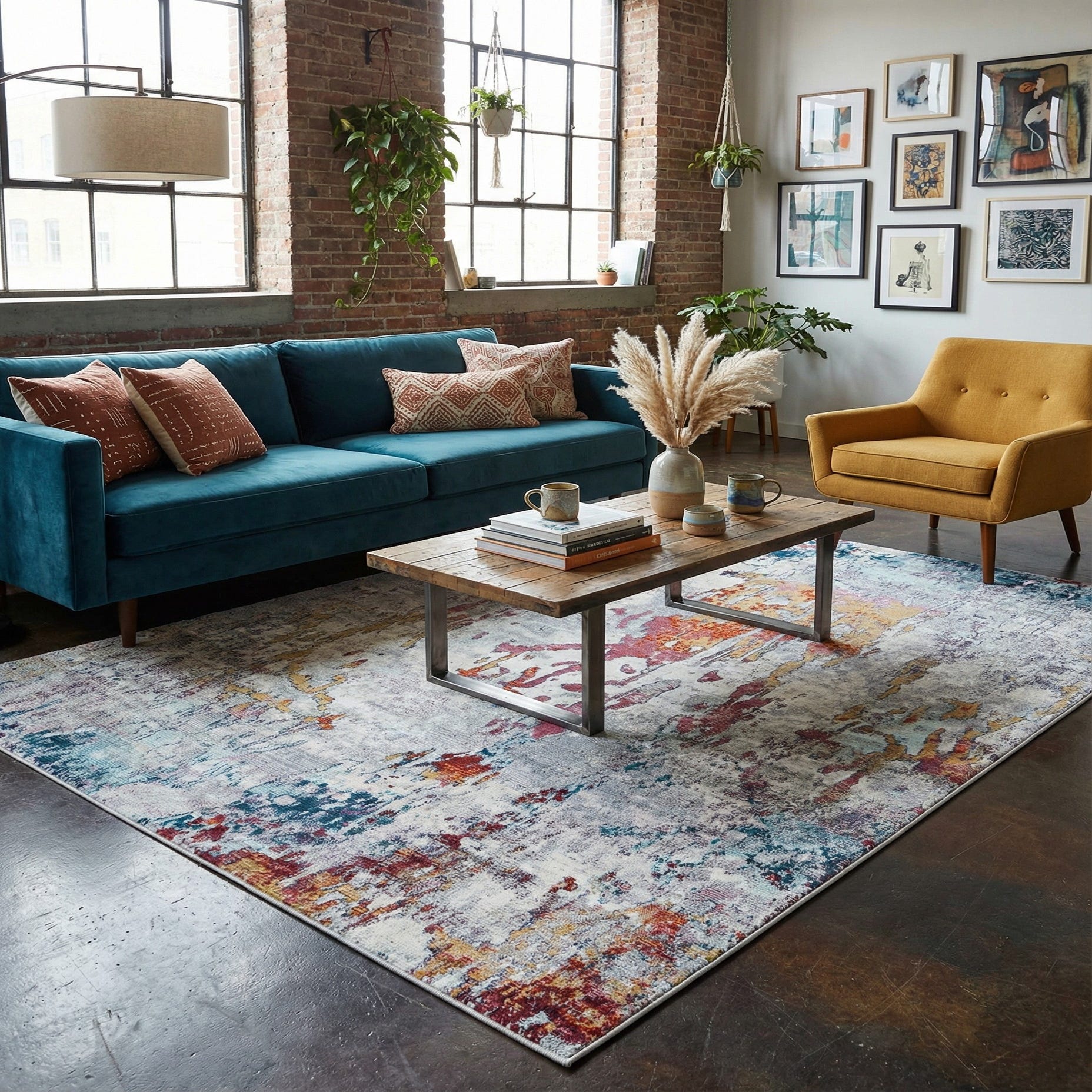 Machine-made from 100% polypropylene, the rug has a low, even pile that feels smooth underfoot and carries a subtle, satiny sheen. The tightly woven construction keeps the surface flat while the multicolor pattern adds visual texture without heavy thickness, making it easy to place under furniture or in high-traffic rooms. Pair it with neutral sofas and warm wood tones for a balanced living room, use it to anchor a dining area beneath a table, or add it to a minimalist bedroom to introduce color and movement; it also layers well in eclectic or industrial schemes where contrasting hues and finishes are part of the design.