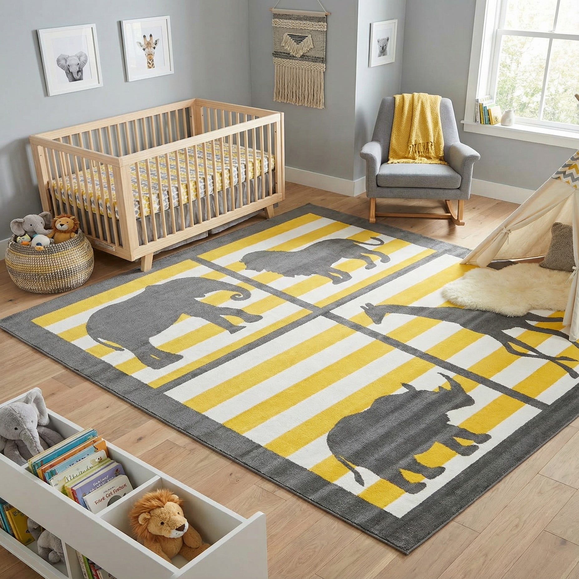 A playful, graphic panel design arranges four window-like boxes across a grounding gray field, each holding a bold animal silhouette — elephant, lion, rhino and giraffe — set against alternating ivory and sunny yellow horizontal stripes. The silhouettes and outer border are rendered in a charcoal-gray that contrasts cleanly with the bright ivory and yellow bands, producing a crisp, modern look with a hint of whimsy. Machine made of 100% polypropylene, the rug has a low, dense pile with a smooth, slightly satiny surface that feels firm underfoot and lies flat, maintaining clear pattern definition.