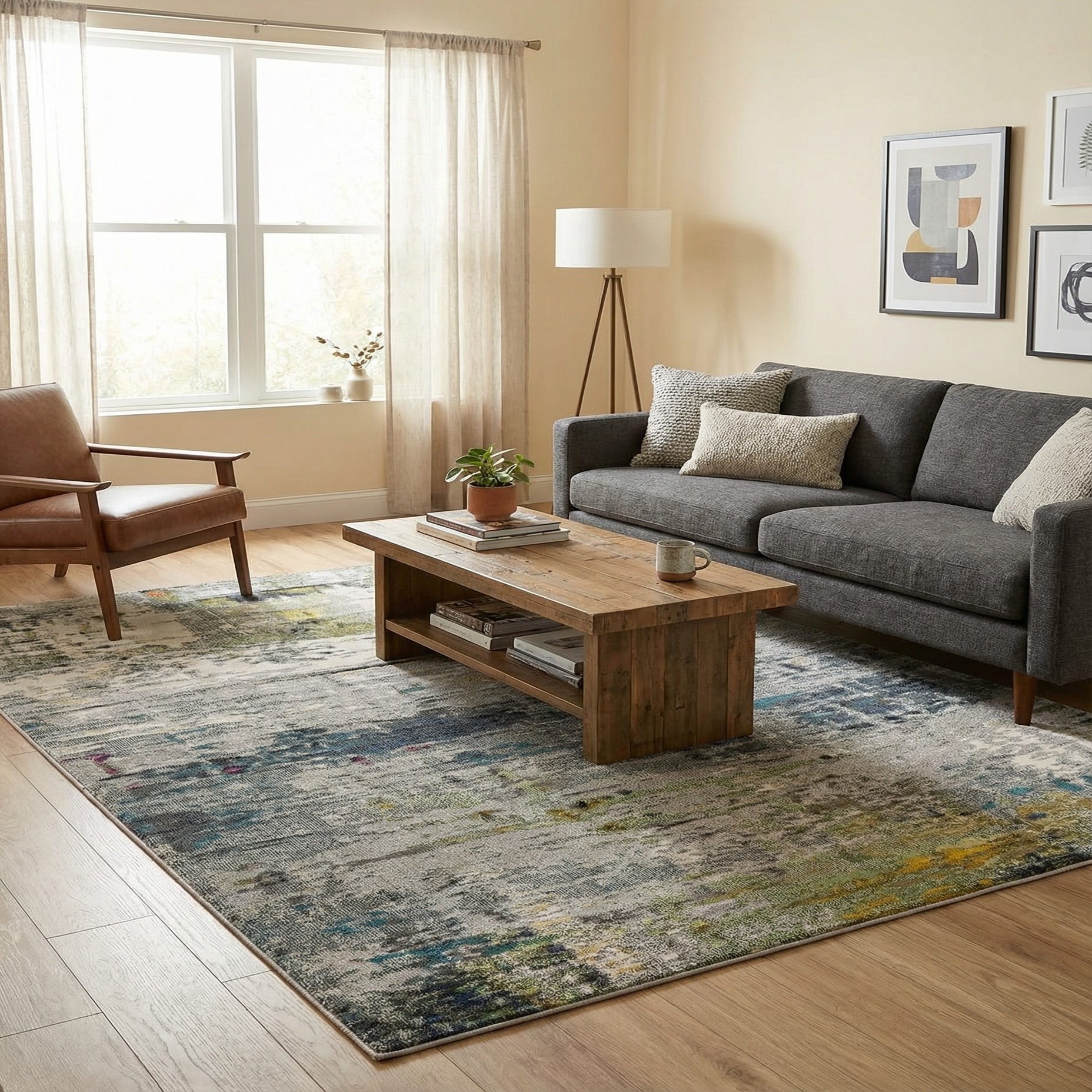 A painterly, abstract field flows across a cool gray ground, where washes of cream and beige sit alongside deeper touches of black. Brushed strokes of olive and green mingle with brighter notes of yellow, orange and pink, while scattered blue and violet accents add subtle depth. The pattern has an artful, layered quality—irregular striations and soft mottling create visual movement without a defined border, giving the rug a contemporary, modern-abstract character. Machine-made from 100% polypropylene, the surface has a low, dense pile that feels smooth and slightly cushioned underhand, providing a pleasant, tactile feel while maintaining a tidy profile for furniture placement.