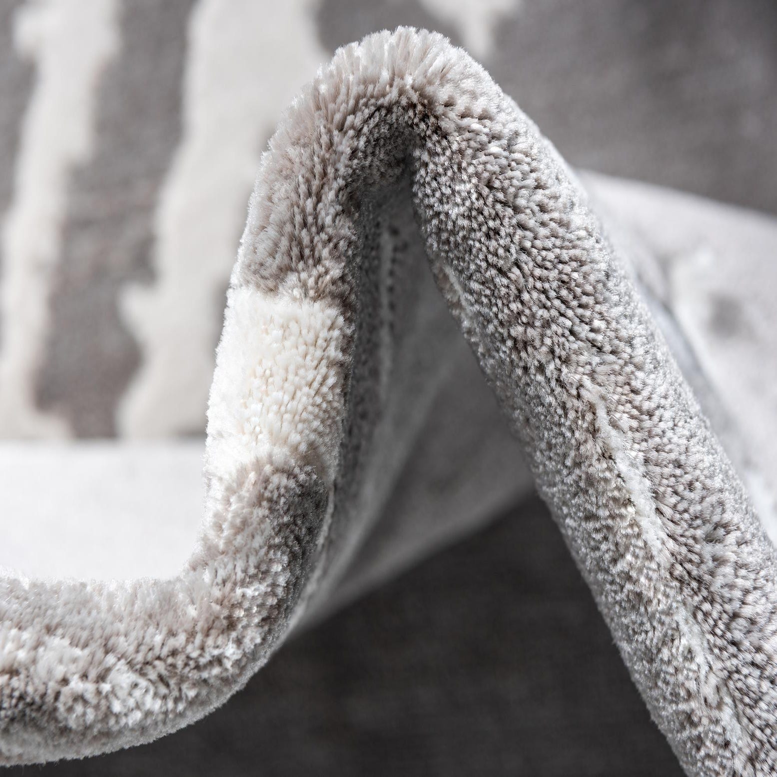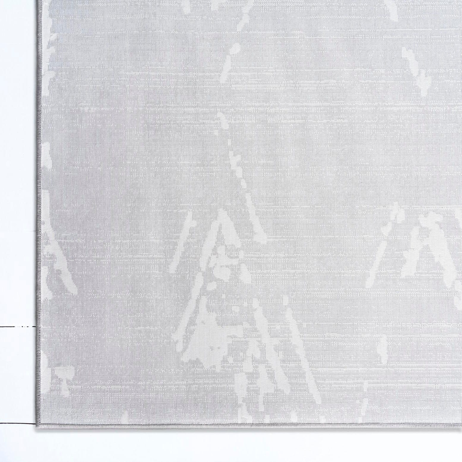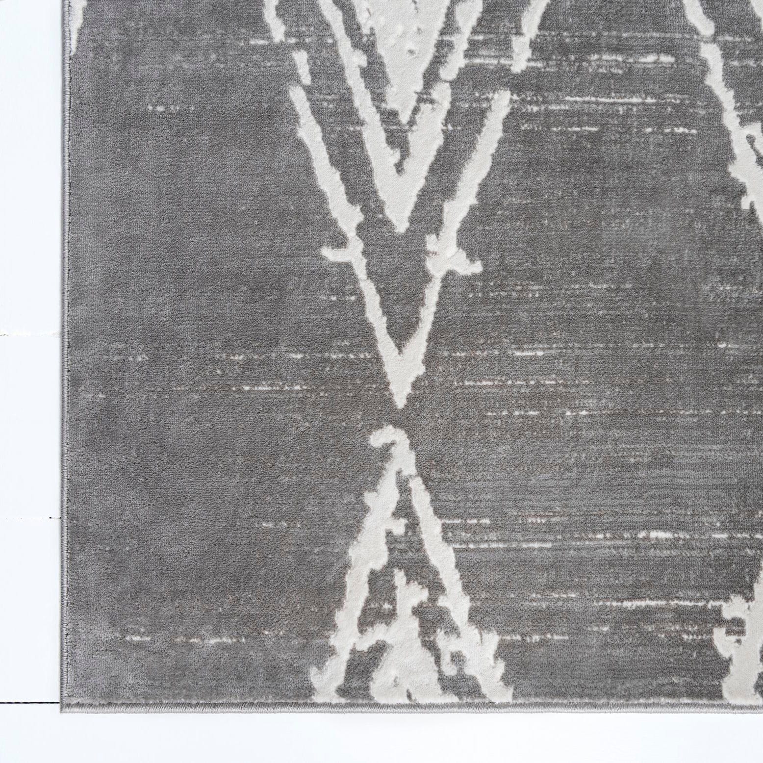 A soft gray ground provides a calm backdrop for an ivory geometric motif of elongated diamonds and broken lines, the pattern given a distressed, hand-weathered effect that adds visual texture without overwhelming the space. Machine-made from 70% polypropylene and 30% polyester, the rug has a low, dense pile that feels smooth underfoot and offers a subtle, satiny sheen as you move across it.