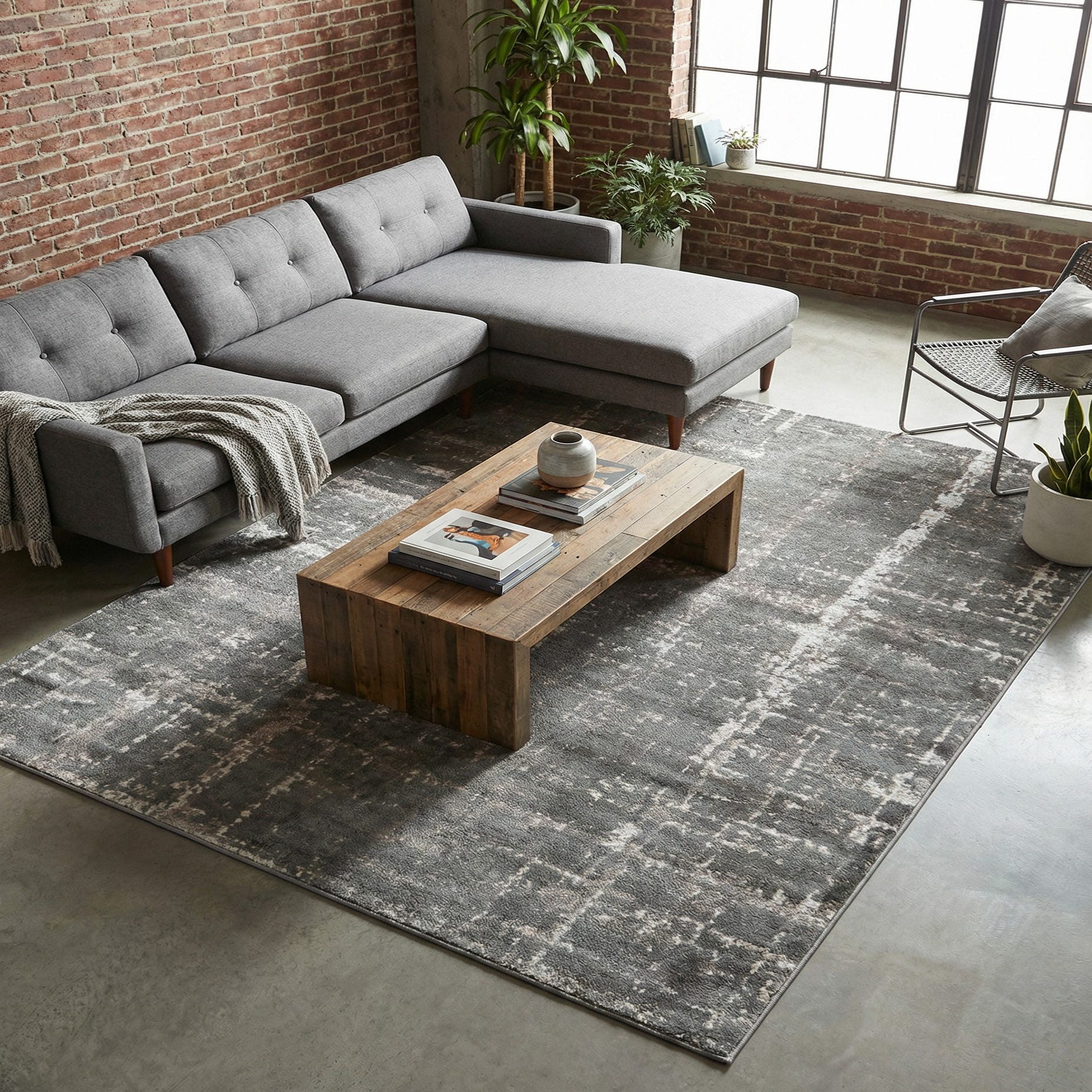 A contemporary, distressed crosshatch pattern gives this rug a quietly modern look. The gray background provides a cool, neutral field while soft beige highlights trace vertical and horizontal lines, producing an abstract, lived-in grid. The pattern has just enough irregularity to add visual interest without competing with furniture or other decor.