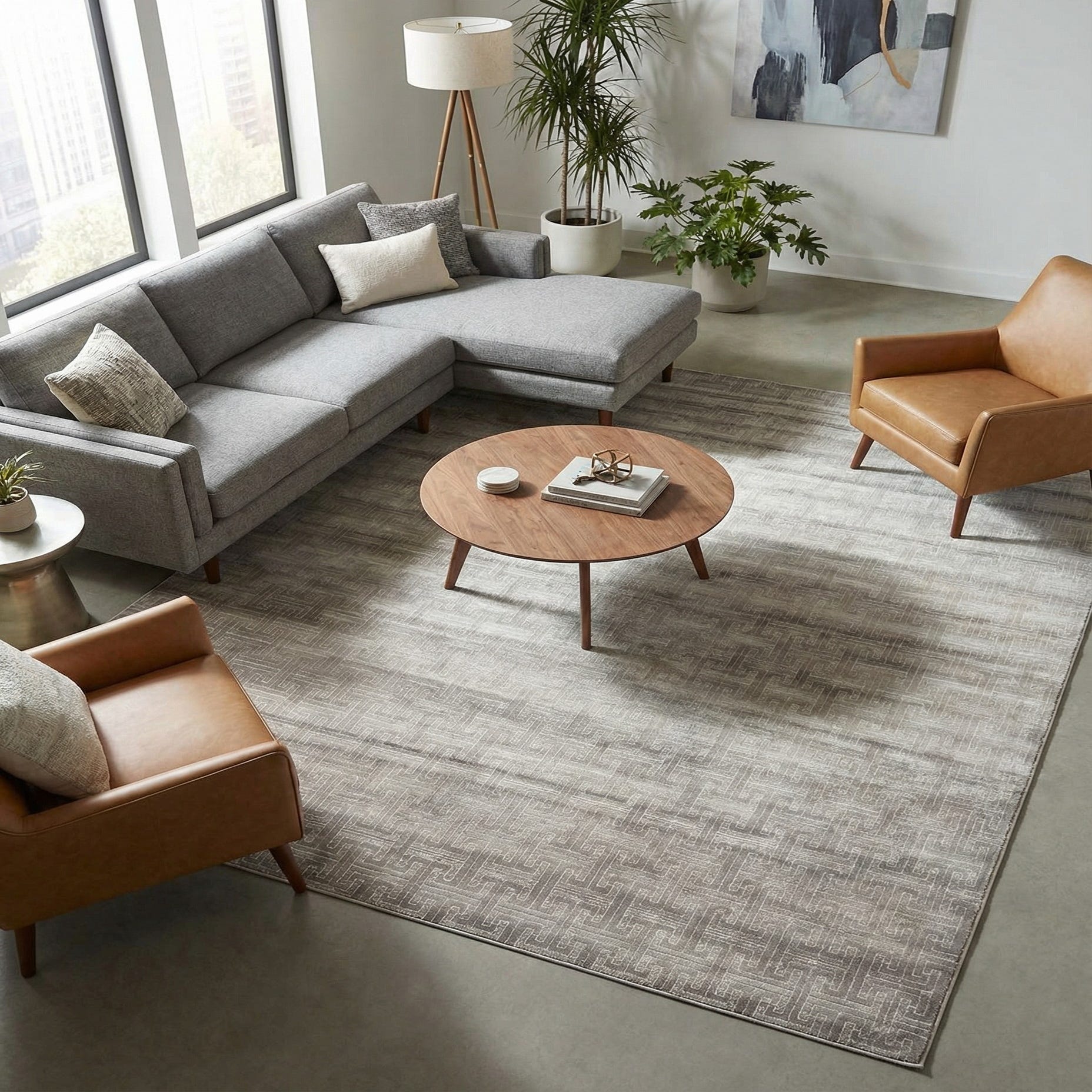 This rug works well as an anchor for a contemporary living room seating group, a calm neutral layer under a bed, or a polished foundation for a home office. Pair it with warm wood tones and metal accents for a balanced look, or let it blend into a cool-toned palette with ivory linens and soft grays for a quiet, cohesive space.