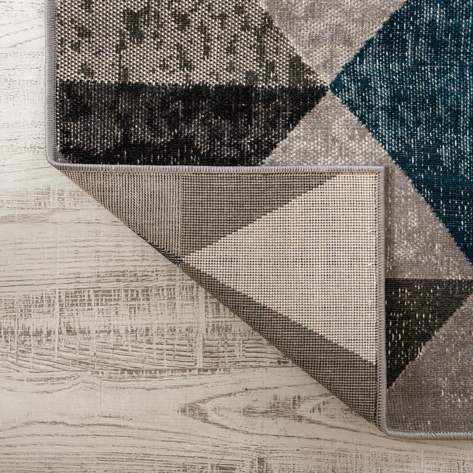 The Valencia collection rug is a contemporary piece that showcases a dynamic geometric pattern, creating a bold visual statement. Measuring 8x10 feet, this rug is machine woven with 100% polypropylene, known for its durability and stain resistance. The design consists of sharp angles and overlapping triangles, rendered in a palette of gray, black, blue, and ivory. The gray background delivers a neutral canvas that allows the accent colors to pop, while the varied shades of black and blue add depth and interest.